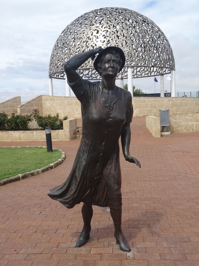 I’ve been to Geraldton quite a few times but never to the HMAS Sydney II memorial site. So we followed the signs in the direction of the towering flag and made our way to the top of Geraldton for a look. This is a great site and worth the effort. There is a Wall of Remembrance for the lost sailors, information about the lost and ultimately found ship, a dome of peace inlaid with gulls, a water feature and a beautiful woman waiting and watching for the sailors to return (click the picture below so you can see all of her) . There’s also the flag atop a replica ships stern towering high in the sky (again, click the picture below so you can see it all and The Newby at the base of it). I really recommend you visit this spot if you’re in the area. I was especially moved by the lady and the gulls. The dome of gulls forms a canopy, inspired after a flock of sea gulls swooped over the crowd assembled to dedicate the memorial site which occurred at the setting of the sun, while the notes of the Last Post rang out in the evening air over the Indian Ocean, on the West Coast of Australia where HMAS Sydney sank without a trace, 57 years before. Birds are symbolic as spirits of the dead and historically, the souls of drowned sailors were believed to be embodied in Sea Gulls. Spooky. As for the lady, she stands at the edge of the cliff holding her hat against the sea breeze, her skirt blown back by the prevailing wind. She is anxious, tense; her gaze forever fixed patiently on the horizon. I hope she knows hey found the ship (for that information be sure to read the small plaque opposite the Wall of Remembrance and check the water feature for the location guide).