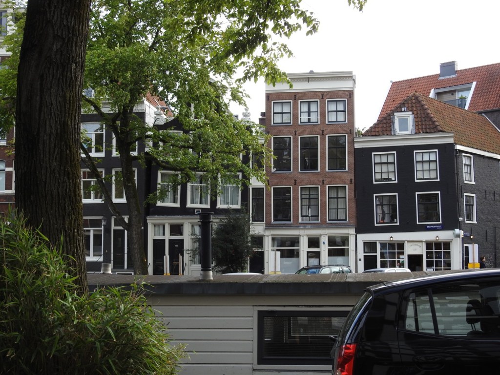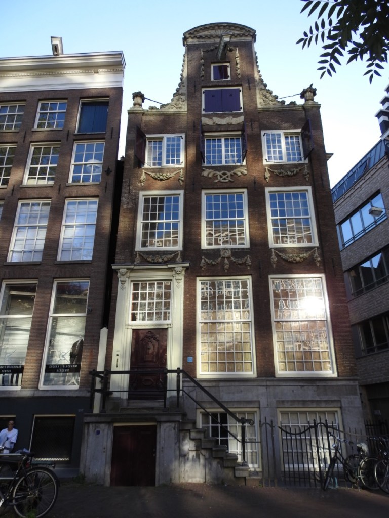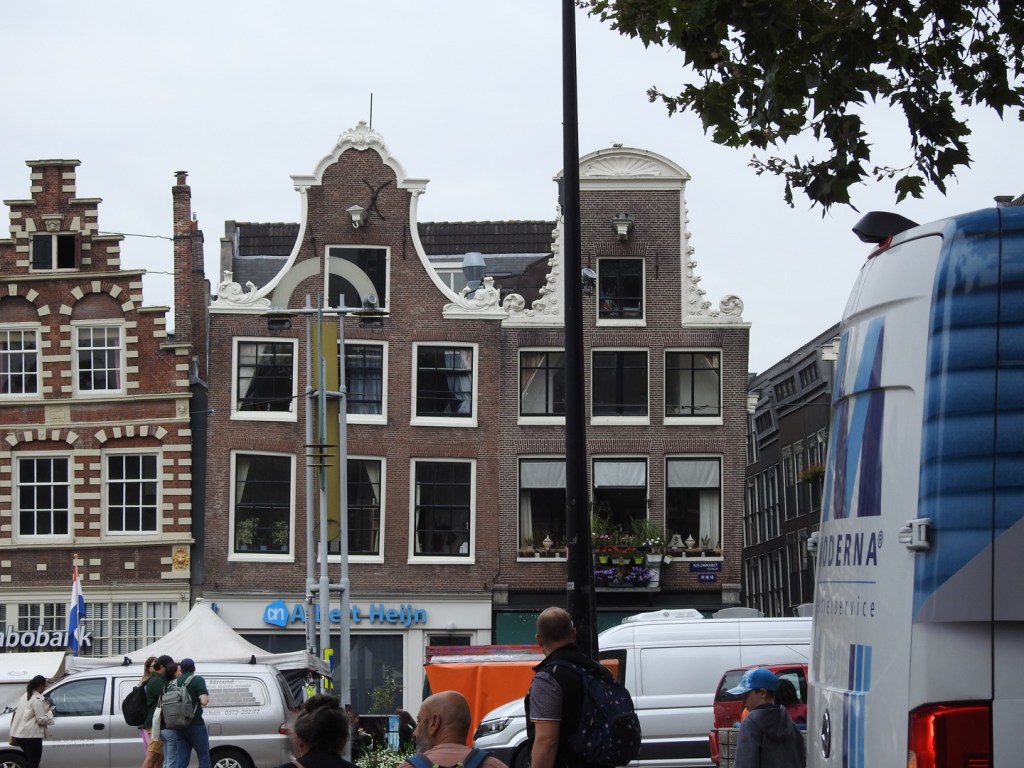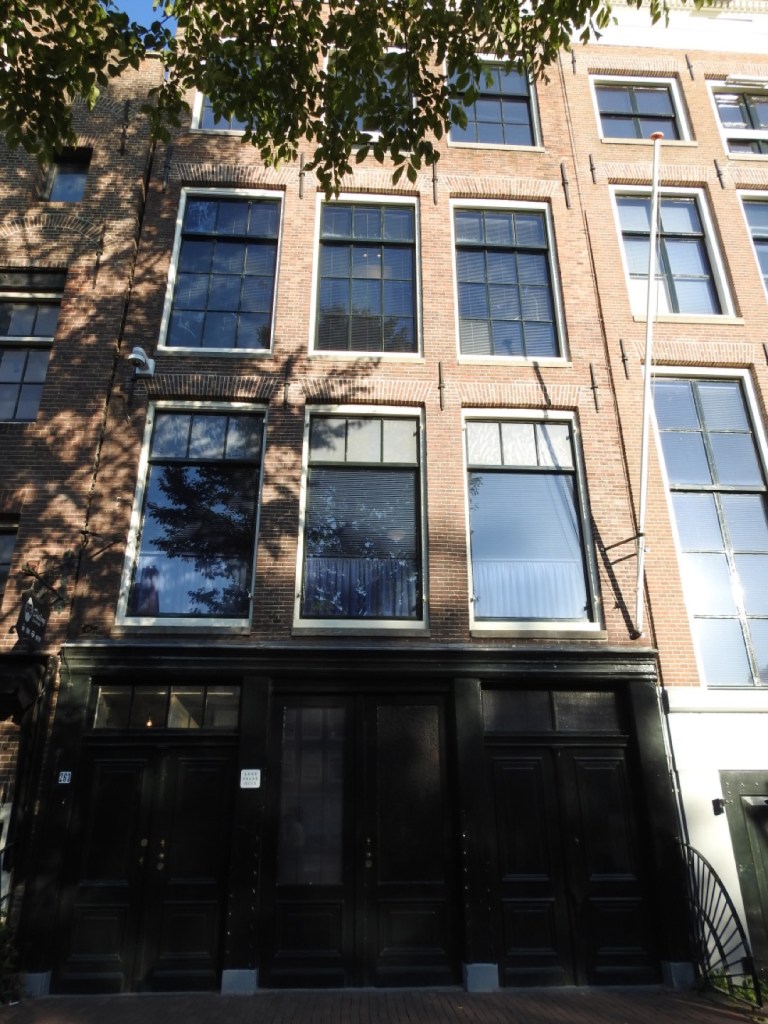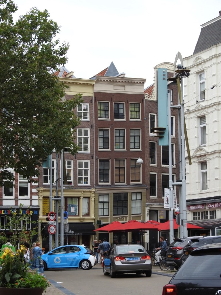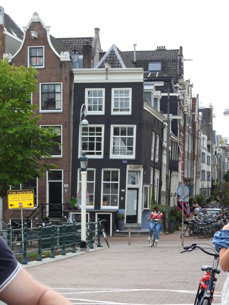 Post-tour, having chaotically returned the bikes, we wandered off to find a beer or two. One thing we did notice on our cycle was a canal boat decked out with tables and chairs, serving beer and food, and thankfully Ampelmann caught the name, so we jumped on a tram and headed there. It was a very nice way to spend an hour, drinking beers and eating bitterballen (again). We got a canal-side table and replanned a route to see a few more of the featured wonky homes. First though, we added a stop past “Anne Frank’s House”. It’s actually the house where the family were hidden from the Nazis, not their family home. The back story for us is that tickets go on sale 6 weeks in advance, online, and sell out in moments! Of course we didn’t know that (probably should have checked) and so we don’t have tickets. However, I have to say that I am not sure I would enjoy traipsing through the house with a million other people. So, we viewed it from the front (the entrance is to the side) and on we went.
