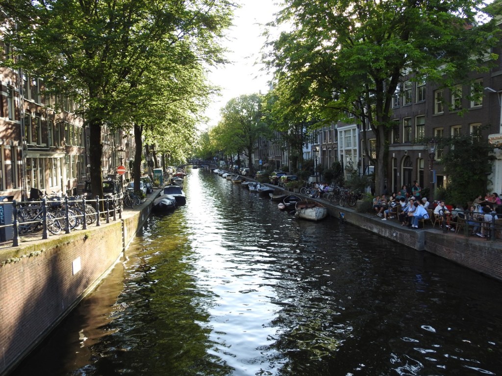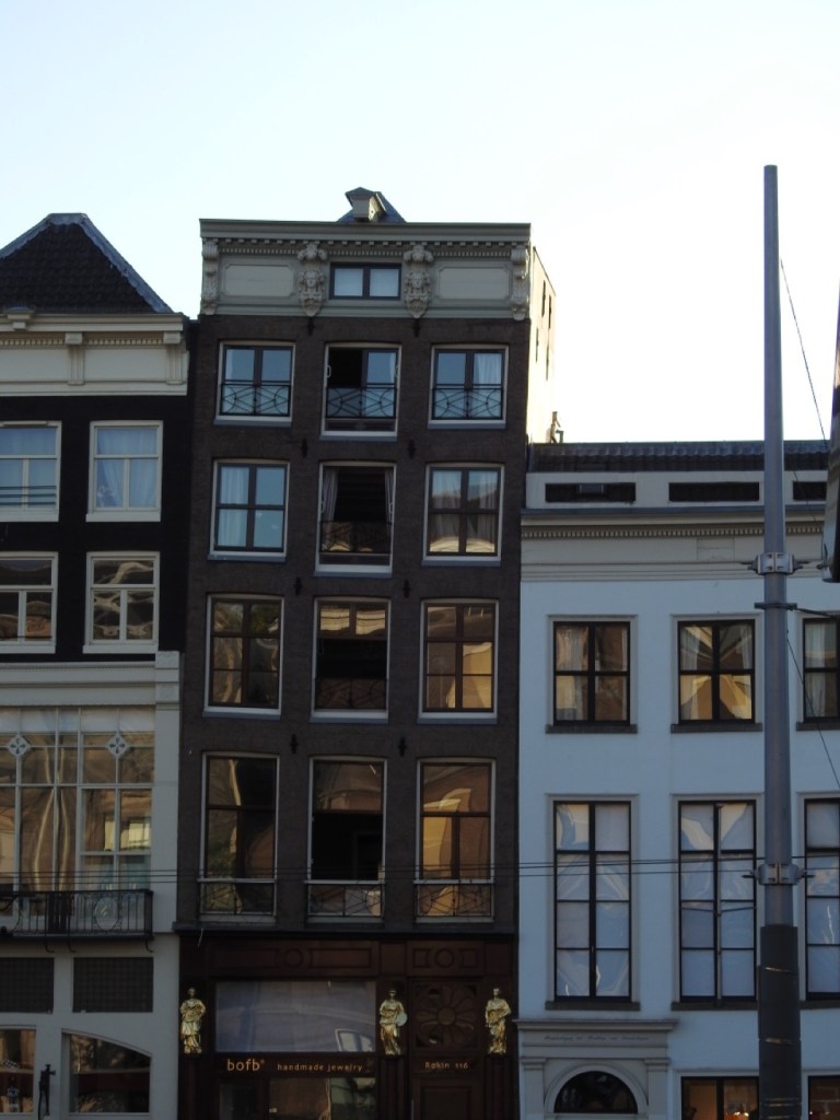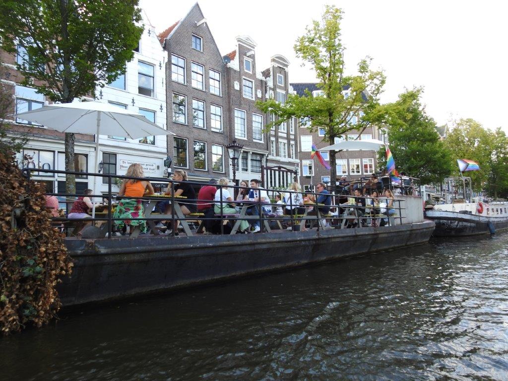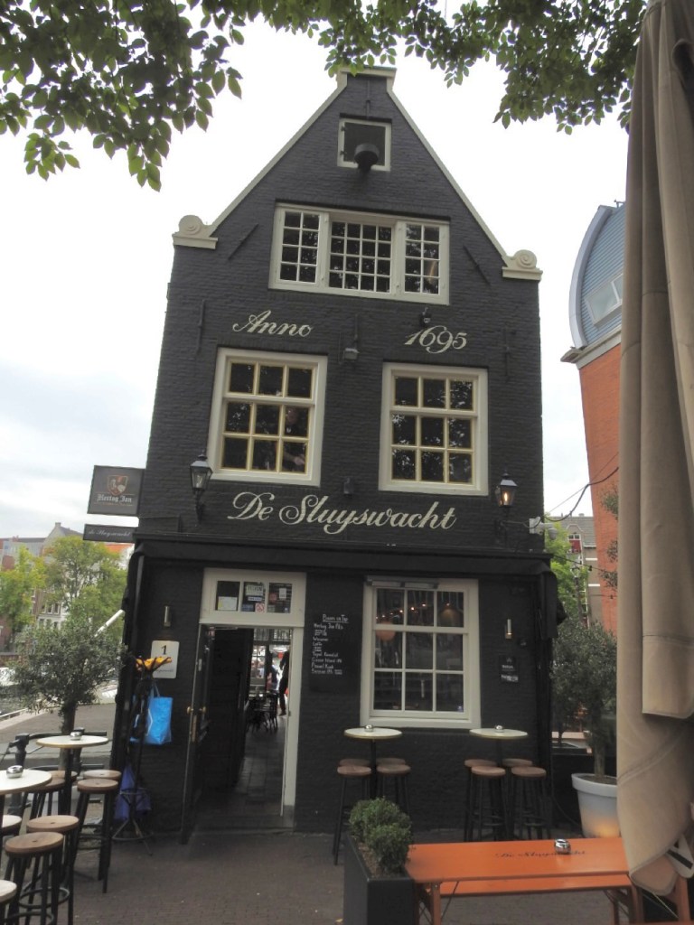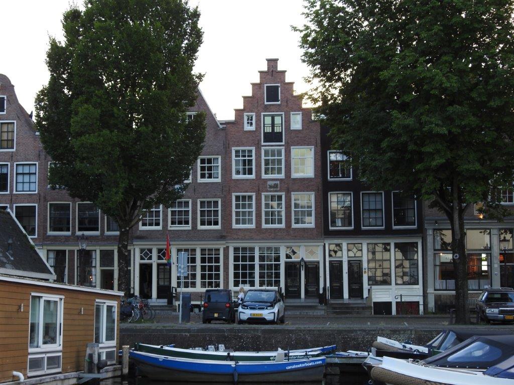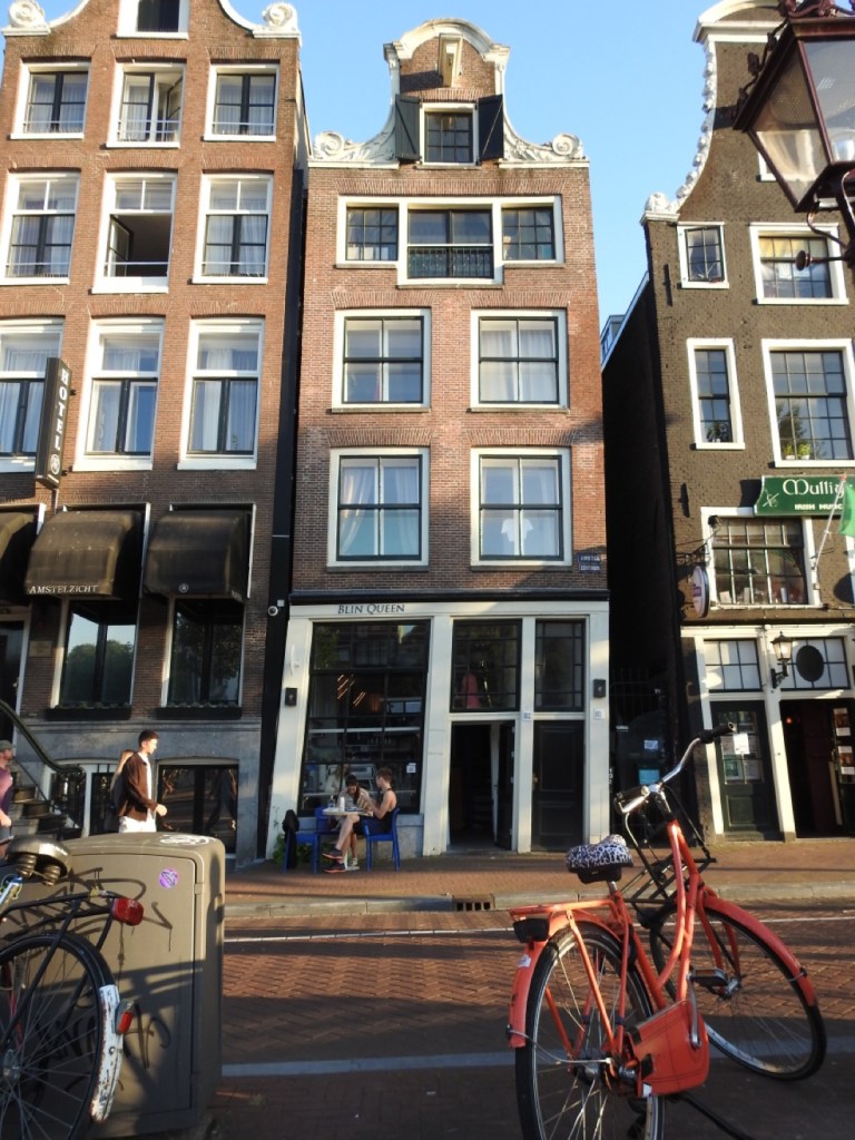 Post-tour, having chaotically returned the bikes, we wandered off to find a beer or two. One thing we did notice on our cycle was a canal boat decked out with tables and chairs, serving beer and food, and thankfully Ampelmann caught the name, so we jumped on a tram and headed there. It was a very nice way to spend an hour, drinking beers and eating bitterballen (again). We got a canal-side table and replanned a route to see a few more of the featured wonky homes. First though, we added a stop past “Anne Frank’s House”. It’s actually the house where the family were hidden from the Nazis, not their family home. The back story for us is that tickets go on sale 6 weeks in advance, online, and sell out in moments! Of course we didn’t know that (probably should have checked) and so we don’t have tickets. However, I have to say that I am not sure I would enjoy traipsing through the house with a million other people. So, we viewed it from the front (the entrance is to the side) and on we went.