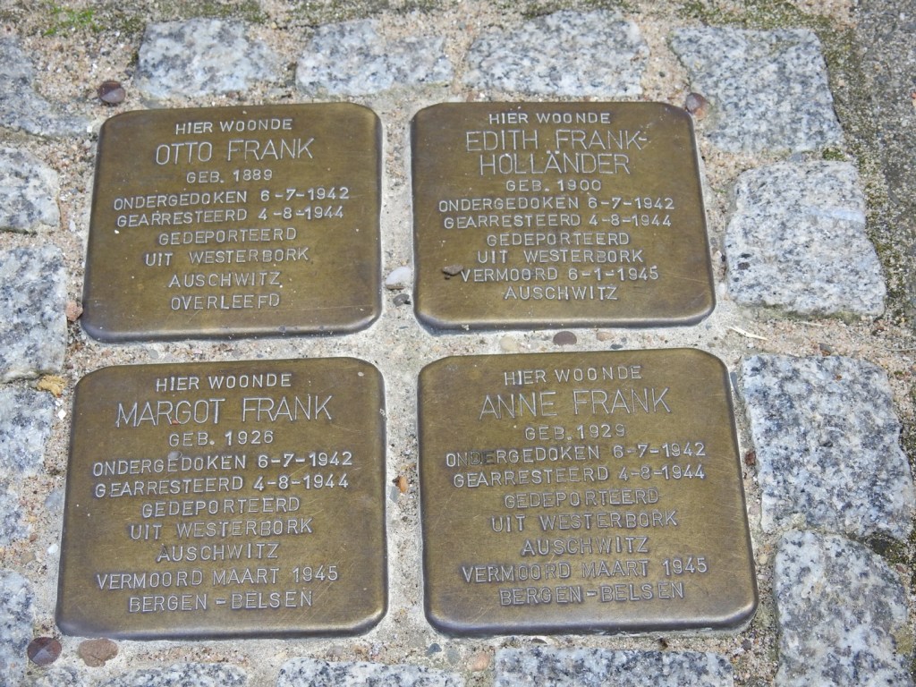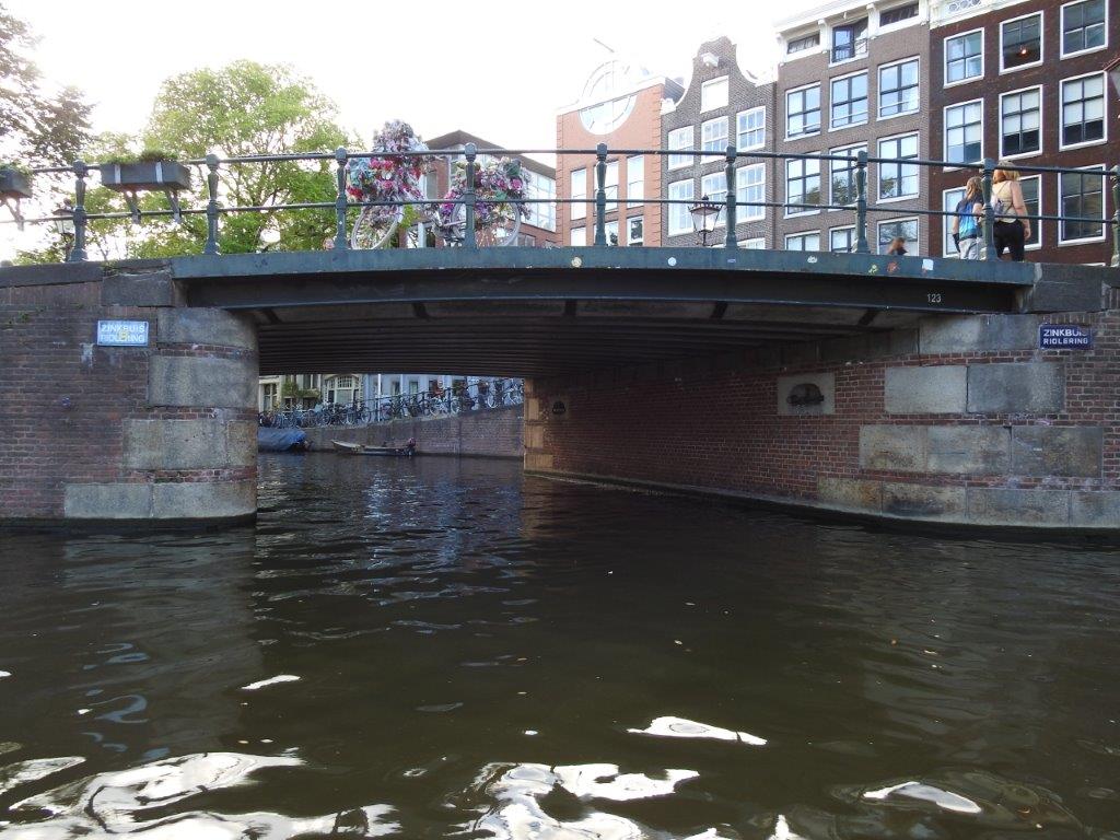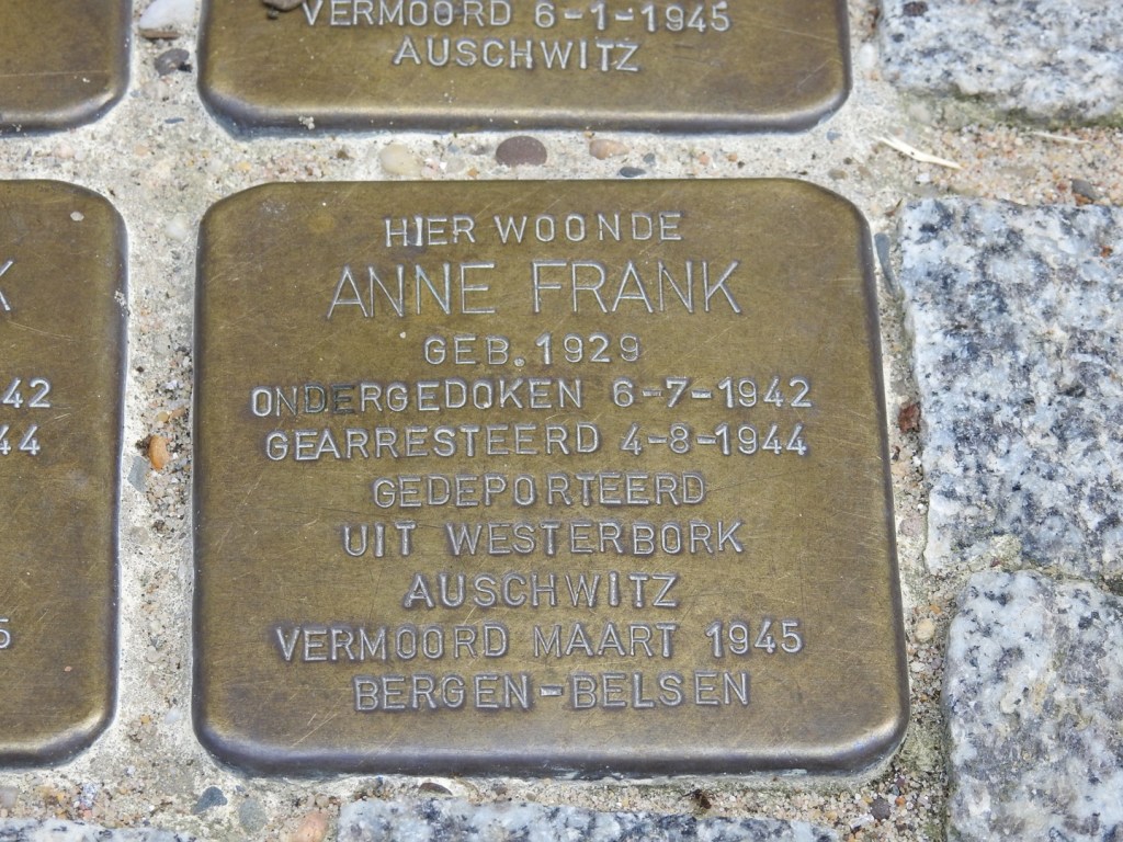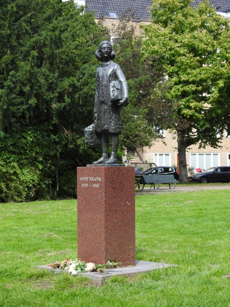 The plan for the rest of the day was to cycle out to the windmills, but by the time we were sorted it was afternoon, so we will do that tomorrow. The revised plan involved a local coffee at the river, followed by a long cycle to the suburbs. Overnight I found out that Anne Frank’s family moved to Amsterdam from Frankfurt and stayed in a house on the edge of the city. There is a small statue there and 4 stolpersteines, one for each of them. Knowing this, I very much wanted to go there and see where she lived and played and walked and enjoyed her life in Amsterdam. So we rode out there. That sounds easier than it was. Firstly, the bikes are heavy and far from luxurious, although this time mine is an adult bike and has three gears! Secondly, there are any number of things to contend with on the route, including other cyclists, mopeds and tiny cars (they use the bike paths), pedestrians, normal cars and intersections! We made it almost 4kms, around to a canal side stop, to catch our breath and cool down. We just sat on a step and watched the world go by. Then we made it another 600m before we stopped for a homemade lemonade and a toasty! Then we made it to our destination! My legs are going to hate me later.