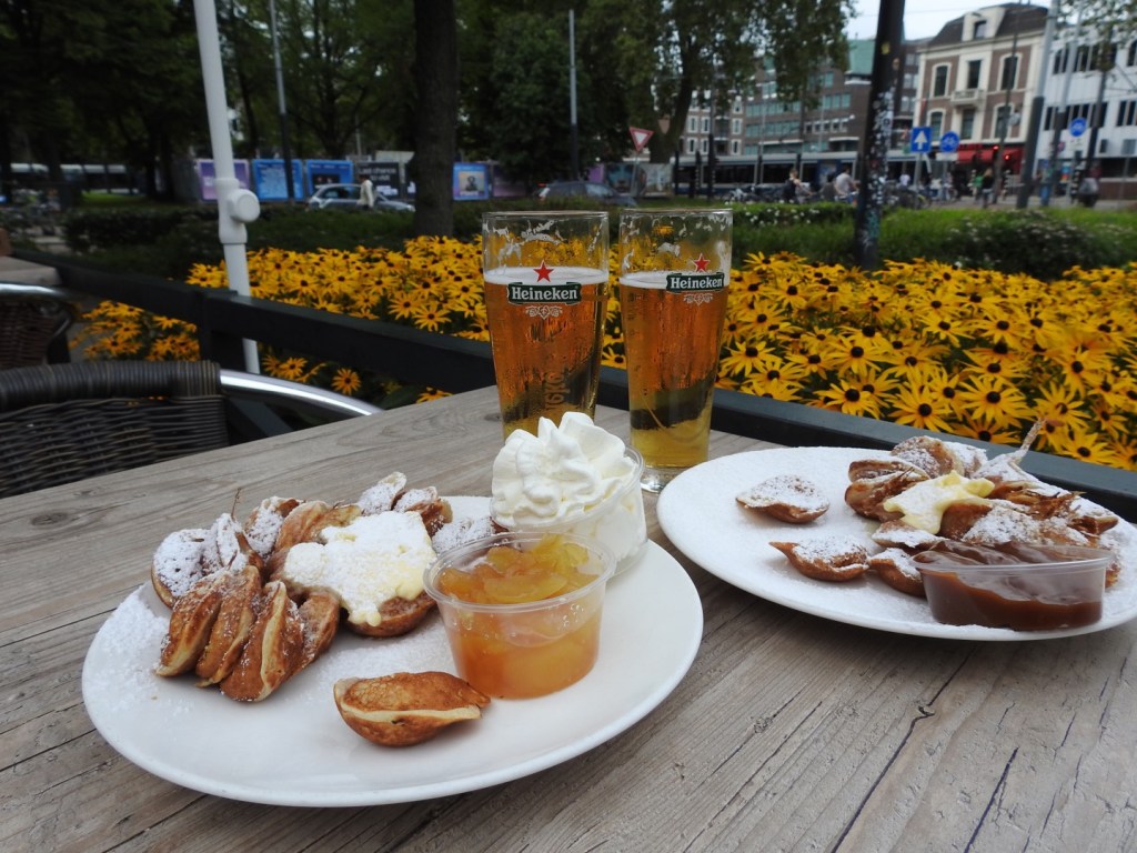 Back on the bikes, we headed into the city again, arriving at Rijksmuseum. There is a beautiful garden with a couple of fountains and some lovely reclining seating, so we just sat there admiring the building, people watching and enjoying the over-spray from the fountains. I could have sat there all day, but Dutch pancakes were calling! Back on the bikes we rode through the museum (that’s how much bikes rule) and out to the pancake place where we indulged in Dutch pancakes with Dutch beer (Heineken). It was actually a nice thing to do, by a lovely garden, on a nice warm afternoon.
