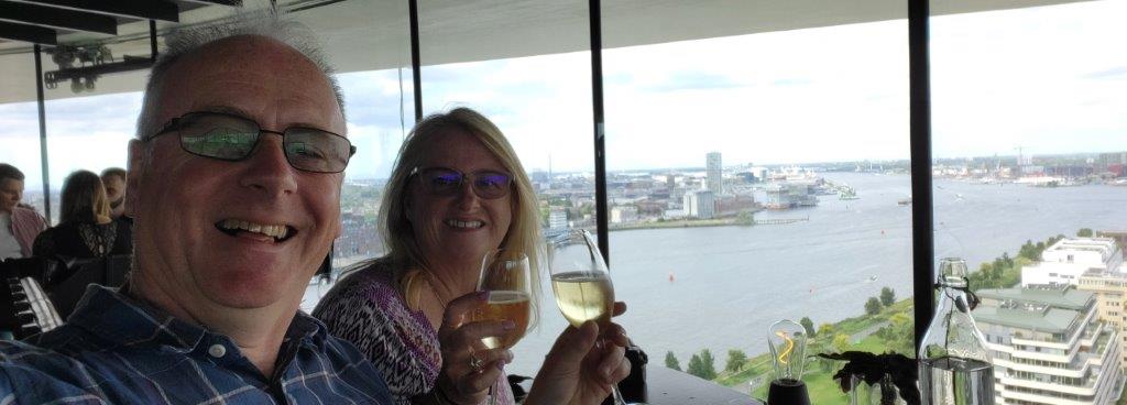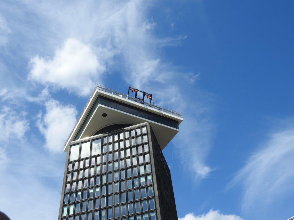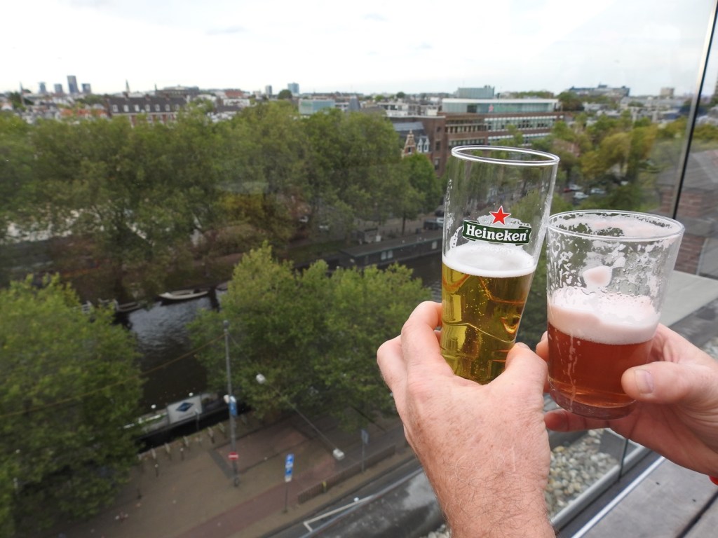 Lunch, of course, has to sadly come to an end, but our intrepid duo haven’t yet had their fill of Amsterdam from their lofty position. Fortunately, they can go back up to the skydeck on the 21st floor, and take their fill of the view, in the sunshine, with a lovely cold Heineken. Bliss.