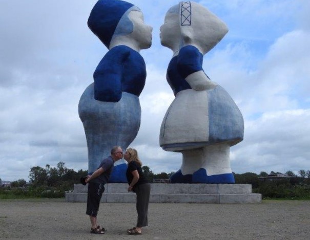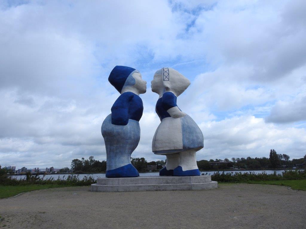 We set off at 09.40, following the route along the excellent cycle way out of the city, which didn’t take long. We cycled past at least 6 wind turbines, reflecting on the fact that the world has come full circle, from windmills to wind turbines. Past the turbines we cycled on to the kissing couple, who overlook the ferry that we used to cross the river. As with our experience in the city, the ferry was excellent and free for us as cyclists. Across the river we cycled past more factories, as well as some lovely riverside homes, arriving in the town of Zaandam. We spent some time watching the bridges open to allow the boats through. It made me think about Perth still having level crossings over railways.