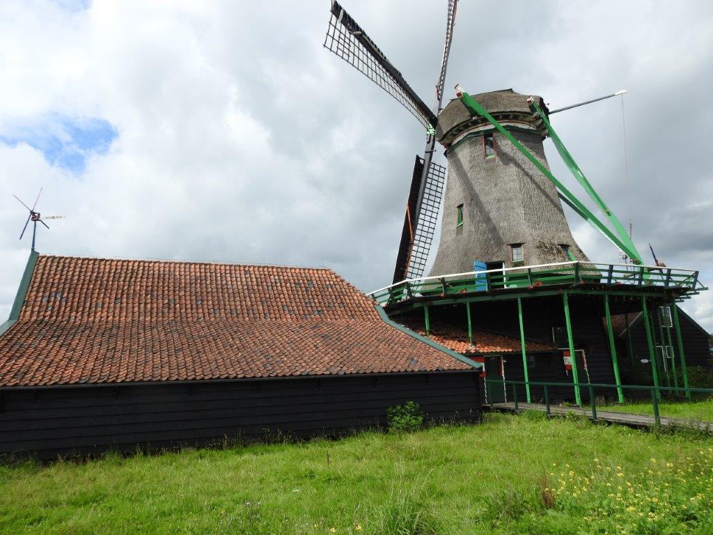 Onwards we cycled through more industrial areas, this time accompanied by the smell of chocolate as we rode past cocoa factories. I would love to live in a place that always smells like chocolate! Eventually we could see windmills in the distance, fifteen kilometres after leaving Amsterdam! There are a handful of windmills are a few associated buildings that have been restored to protect them and are open to the public. We didn’t think this through very well, given that it’s Sunday. Every person and their dogs were out there, but the site is quite big and most had to be back on the bus before they reached the last windmill, so we wandered all the way to it.