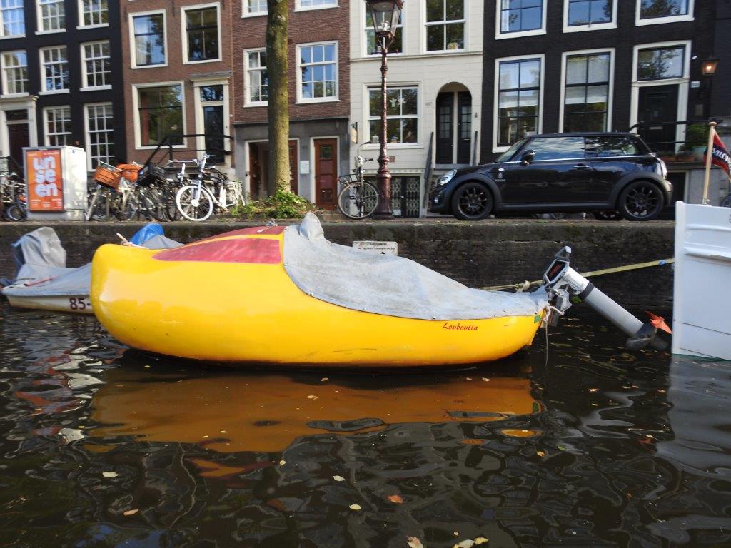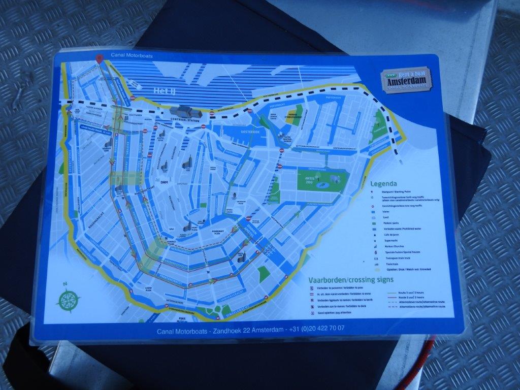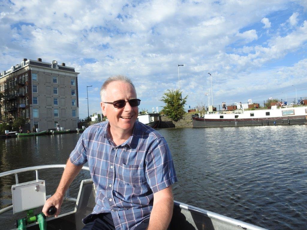 I had previously mentioned that on this trip it would be good to do a canal tour, and, as this was our last night, I reckoned we would be travelling into Damrak, where most of the canal boats leave from. This would have been a fine way to end a fine day in a fine city. I got one bit right. No sooner had we left the house and turned right, I was directed through a wee gate and down a wee towpath, where Tees, a nice wee Dutch guy, was waiting with a boat. Nice, I thought. He’s going to take us round the canals. Nope. Turns out that it’s the Beanster who is doing the driving! And not in a tinny sized thing either – this is proper boat size, with a whisper quiet electric motor. When that all sinks in, and the heart settled down, I listened to where I was to sail.