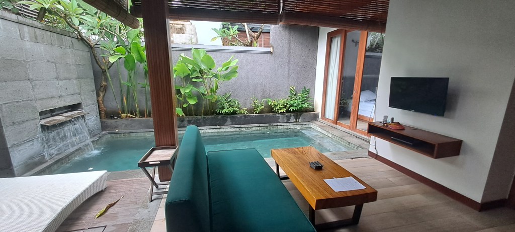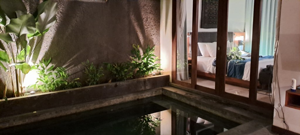 Immediately within the gate we were under the cover of an outdoor living area, with an outdoor kitchenette, a dining table, a couch and a tv. On the fringe of the covered area there is a lovely twin sun lounger and of course, the pool! Through to our room we were impressed with the king-sized bed, another tv, a dressing table / desk with a big mirror and some deliciously cool air conditioning. The entire back wall of the room was covered with a pair of drapes that block the light from floor to ceiling, wall to wall windows. Through to the semi-outdoor bathroom we were delighted to find a huge shower recess, double sinks, a semi-outdoor free-standing bath and the loo! Our overall impression of our compound was that we would be very comfortable for the entirety of our stay and may not ever need or want to leave. Despite being late, there was really no option but to try out the pool. Absolutely delightful. It’s going to get well used over the next few days.