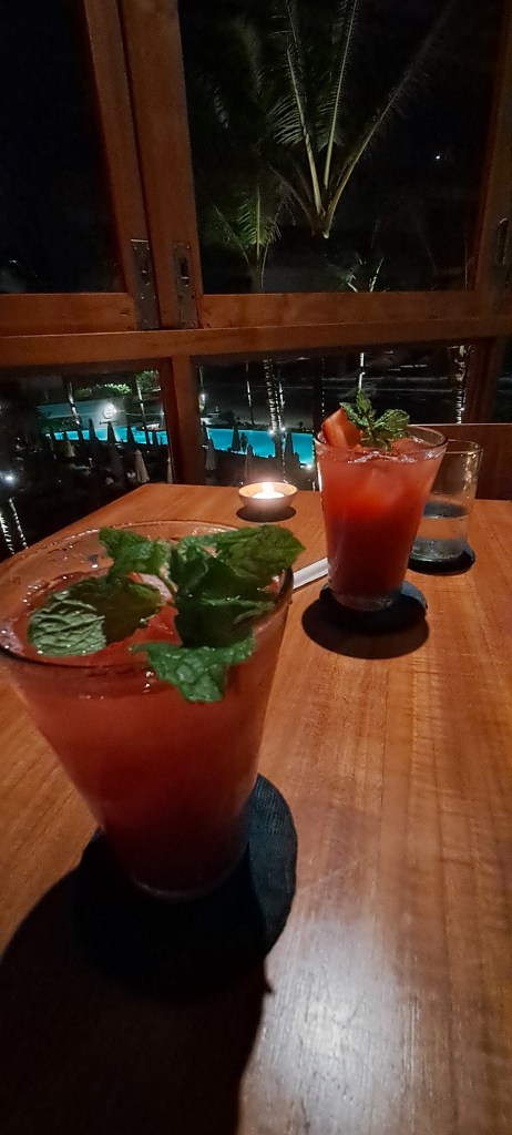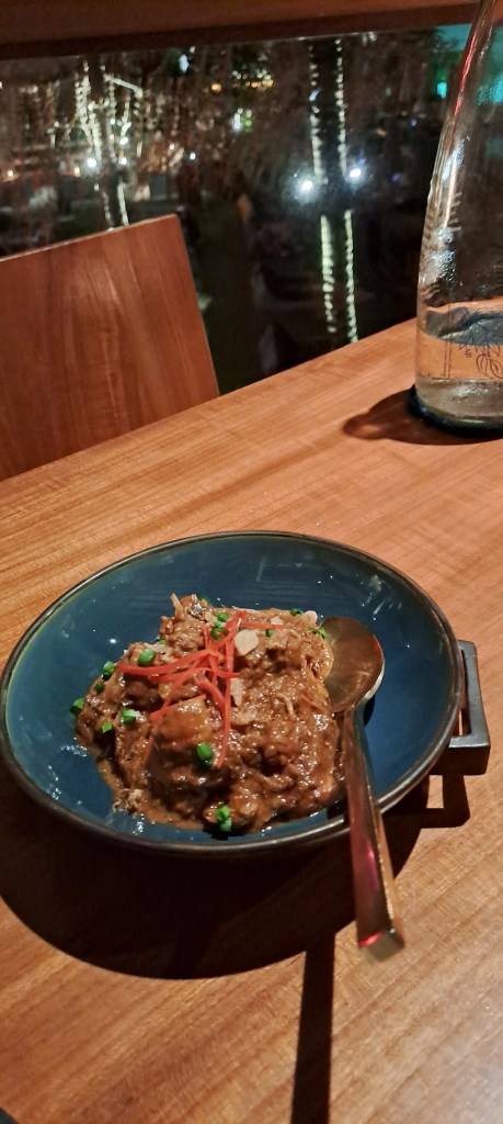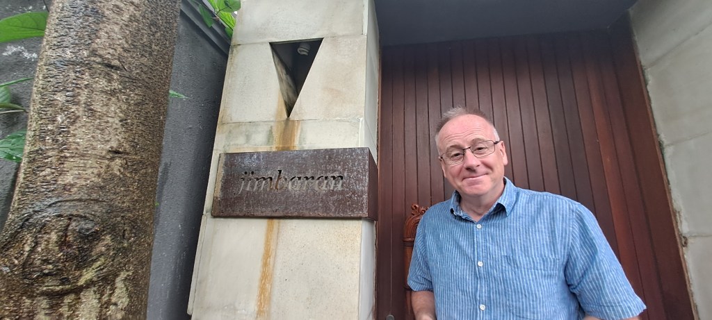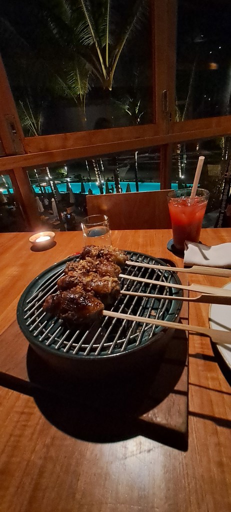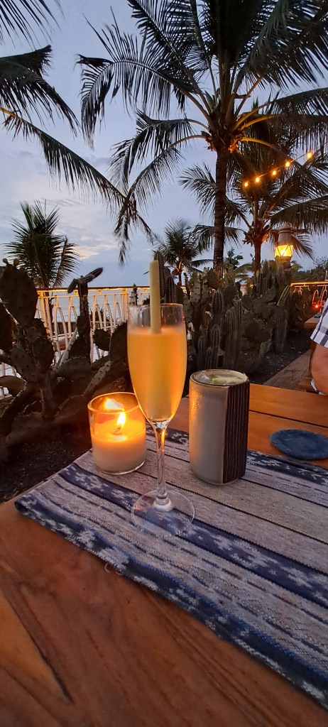 Back home, we spent the afternoon poolside, sun soaking and resting, conscious that we are heading home tomorrow. As the evening approached though we got ready for an evening out, Jimbaran’s family gifted us some money for Christmas, so we decided to treat ourselves to a swish meal at one of Bali’s finest restaurants, Kaum Bali, at Potato Head. The restaurant is part of the Potato Head Beach Club area. I have never experienced a beach club, and looking down on all the people crammed into that little club area for the day, I can see why. I am sure the folk there were having a nice time, but I was glad we were having a better time! We thoroughly enjoyed delicious drinks on the balcony overlooking the sea at sunset. I thoroughly enjoyed a gorgeously presented cocktail called Indo, mixing lemongrass-infused gin, citrus juice, mint, spiced syrup, and sparkling wine. When our table became available we were escorted inside to “The dining room of Kaum Bali, thoughtfully designed to reflect the rich culture and traditional craftsmanship of Indonesia. Concrete wall panels have been stamped with motifs from genuine Torajan wood carvings, known as pa’sura (or “the writing”). Bespoke ceramic tableware by Gaya is used for serving and the long communal table in the centre encourages guests to eat in the traditional family-style manner of Indonesia’s tribes”. Very nice.