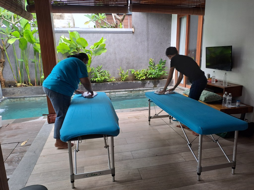 After yet more swimming, listening to our play list, reading about Michelle Obama’s new hobby of knitting (who cares?) and generally relaxing, the afternoon arrived along with the 2 therapists and their two massage beds. Last week, via Klook, we booked a 3-hour massage each, comprising one hour Balinese massage, one hour body scrub and one hour facial. At $45AUD each we couldn’t resist. I was very much looking forward to it, but once booked, didn’t give it another thought. Jimbaran on the other hand must have been mulling it over, because last week, lying on Rockingham beach, he asked me “so what does a facial actually involve?” I can confirm now that the facial is done, that my description of cleanser, scrub, mask, toner and moisturiser, with a massage for good measure, was accurate and I think Jimbaran is a convert. It was superb, as were the Balinese massage and the scrub! What a luxurious way to spend 3 hours when the aim of the trip is to rest and rejuvenate. Time for a shower and another swim.