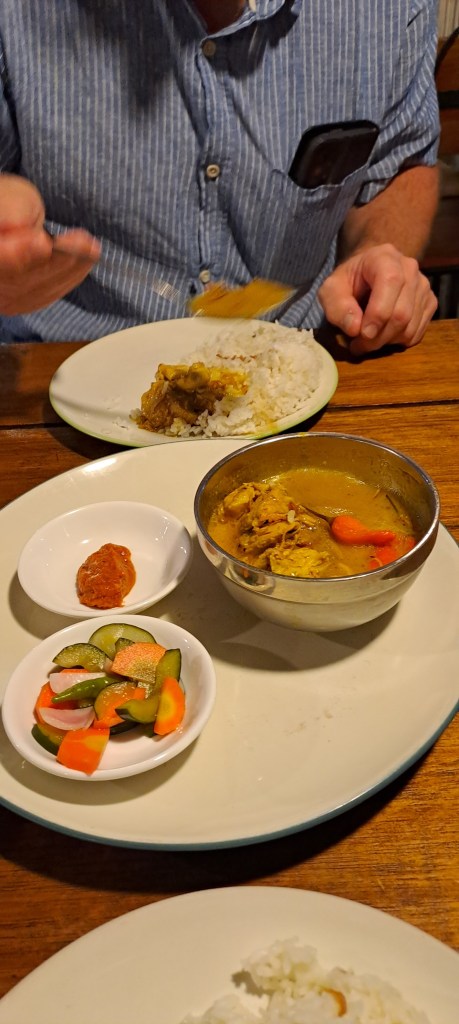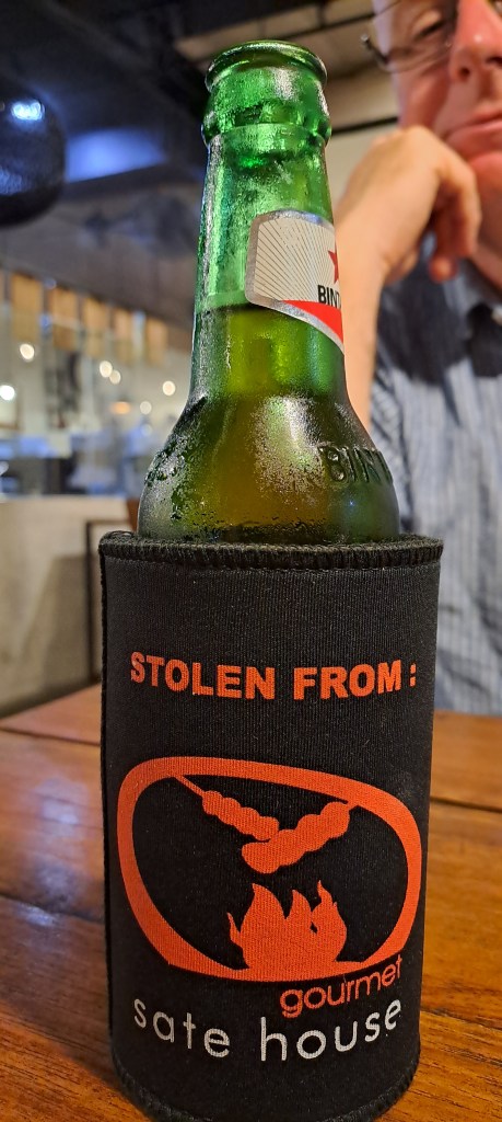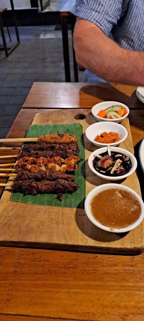 We were waited on very well. We chose and thoroughly enjoyed every mouthful of the Sate Buntel Dengan Acar Rujak – Grilled lamb satay wrapped in caul served with pickled vegetables, rujak-style, the Rendang – braised beef in a mixed West Sumatra spice and fresh coconut milk sauce, red bean and potato, and the MIE GOMAK – Wok-fried noodles with shredded grilled chicken, andaliman spices, fresh curry leaves and coconut milk sauce, all washed down with a pair of Rocket Juices, mixing strawberries, pomegranate, citrus, guava and tangerine juices, with house-made hibiscus syrup. Despite all that food and drink, we were unable to spend the funds, so there are some left over for tomorrow … If you are in Bali, we would highly recommend all three places we ate at, each different, with different budgets and different atmospheres, but all delicious.