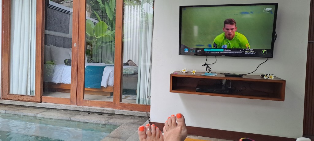 The rain stopped just before 12 and just in time for my pedicure appointment. The Balinese pedicure was similar and dissimilar to my usual experience in that it took a full hour and half (much longer than normal), but lacked a massage chair. As with the coffee, the cost was similar to home, but it was very much a boutique Balinese experience, not a beachside one like my manicure I had on my last visit. Now with bright orange toenails I am ready to cheer on The Scorchers tomorrow when they take on The Sixers.