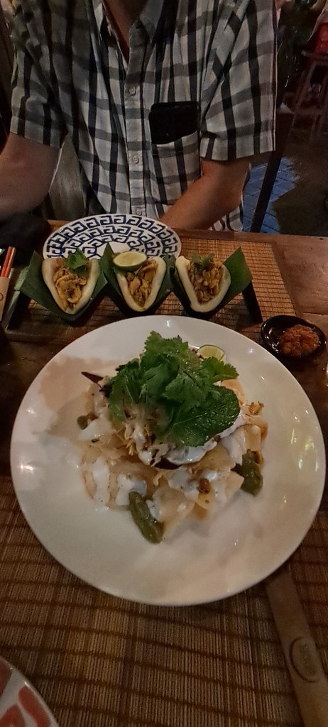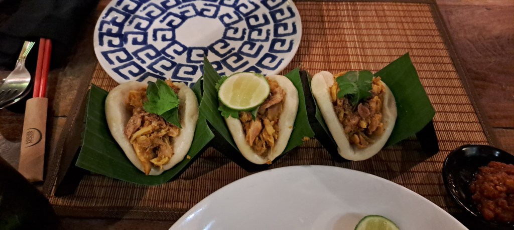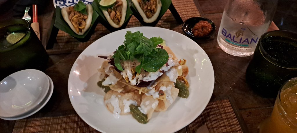 Although it’s a rest day, we did take a wander down the road to grab a coffee and pastry before heading home to watch the cricket from the comfort of the pool. The sun stayed out for the rest of the day and we stayed in our compound, resting and relaxing. Eventually the need for food was raised and I requested “ginger”. With that brief Jimbaran was on the case and found us an option in Seminyak. With the cricket in Sydney washed out (and Brisbane beating the Thunder on DLS calculation) we were ready for dinner at Ginger Moon in Seminyak. To get there Jimbaran ordered us a grab and we were on our way through the busy streets of Bali. Without a booking they found us a great table outside and I was sipping on a Jamu Kunyit – Gin + ginger + lime topped with tumeric jamu + soda. Oh my goodness, such a lovely cocktail and fitting the bill of ginger and gin! Jimbaran indulged in Bintang as we decided what to eat. We settled on Bali nachos, Ayam Pelalah, nasi goreng and dumplings. So much good food, so little time. Completely stuffed (like the dumplings) we headed home in the rain for a sleep after our busy rest day. We are looking forward to tomorrow, an activity day in our itinerary …