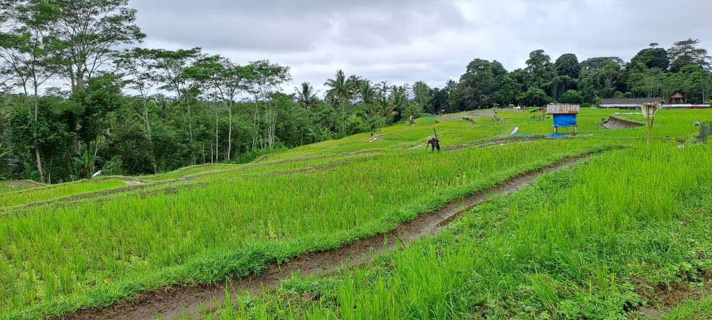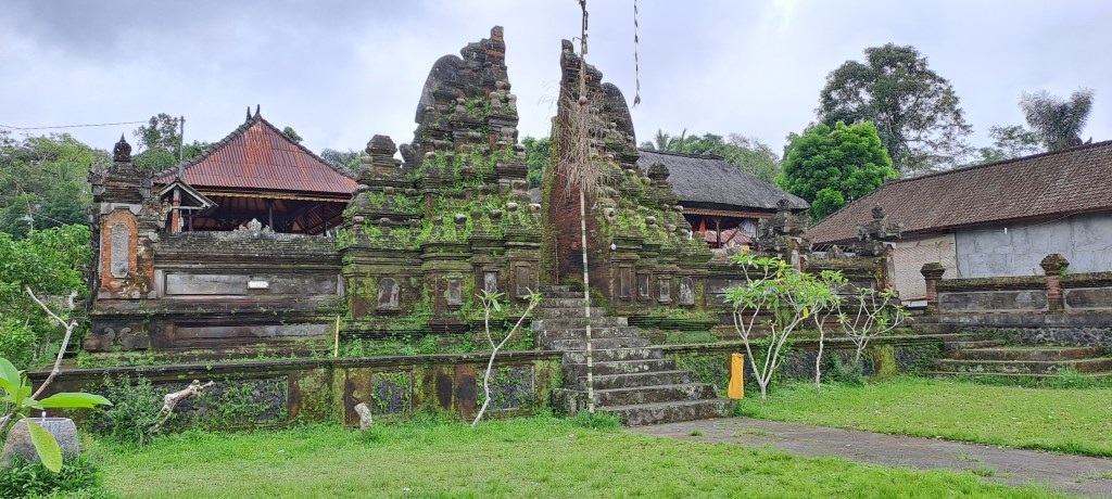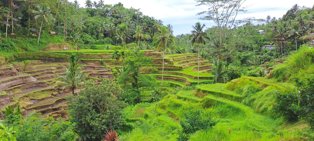 Not far from here our downhill ride came to an end at a warung (like a kitchen outlet) with an amazing view over the rice fields. We were given a lovely meal, with some delicious fried soybean cake that I want to eat again, some cold water and some cool, fresh fruit. Kadek and the driver didn’t eat with us, explaining that the idea of eating with other people is unusual in Balinese culture and it would make them feel uncomfortable. In fact Kadek explained that most families only eat breakfast together, then duck out and eat at warungs during the day, on a needs basis. So we enjoyed our meal together loving the view and reflected on how awesome our day was. All too soon, but also just at the right time, our tour came to an end. We were very comfortably transferred back to our accommodation where it was raining, and looked like it had been all day. How lucky were we to have had a beautiful, dry day? It would have been completely different in the rain.