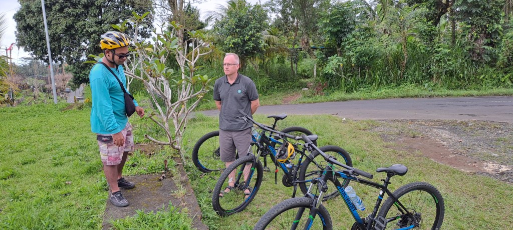 Oh dear, it’s raining again. The pool is full of water, Jimbaran’s shoes are wet from the coffee run and we are going cycling! Well actually, we are going to sit on a pair of bicycles and roll down the hill. I have heard this is a fun and easy thing to do, so we booked this through Viator, recommended by the Bali Bible. My only caveat was, that if I have to pedal, I want my money back.