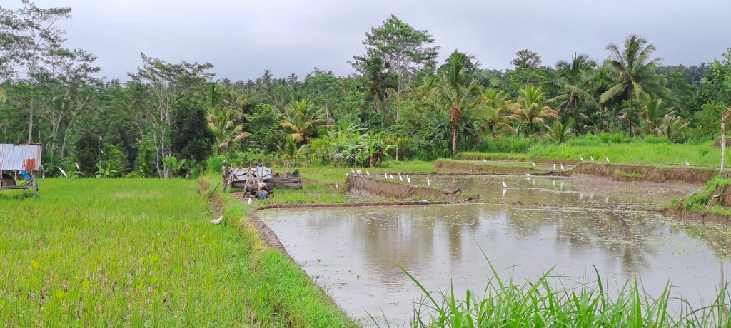 About 2 hours after we left Legian, we arrived in Ubud and our car stopped in a farming area for us to start our descent. The bikes were offloaded, we were provided with helmets and water, we checked our bikes and affirmed the brakes were on the Australian sides, and off we rolled. Initially we rolled past rice fields, with people working to plough and plant rice. We saw the hand operated plough in action, a difficult beast to manage when you are in knee deep mud. All around the plough operator there were white herons, hoping for a feed of eel. The people we saw here were working their own plots, with their transportation parked along the road.