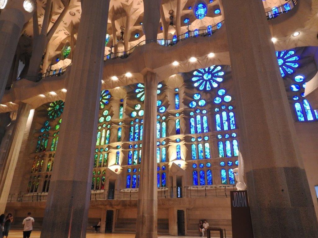 Still chugging on with our busy day, but a bit rejuvenated after the rest in the jardin, we jumped on a bus (with a very cranky driver who shut the door in my face!) to head along to the sagrada familia for our booked look inside, with audio tour. While we are using the public transport system, we haven’t got the hang of it completely. It seems like there might be public and private companies operating the buses, making it a bit confusing. Nevertheless we got to our destination and (here’s a first), I didn’t call out a “thank you” to the driver. We arrived at the temple (also called a basilica – not a cathedral) just as our allotted time started and we were the last to leave, an hour later. The audio tour is an excellent way to see the best parts of the facade and the interior. The two are quite different.