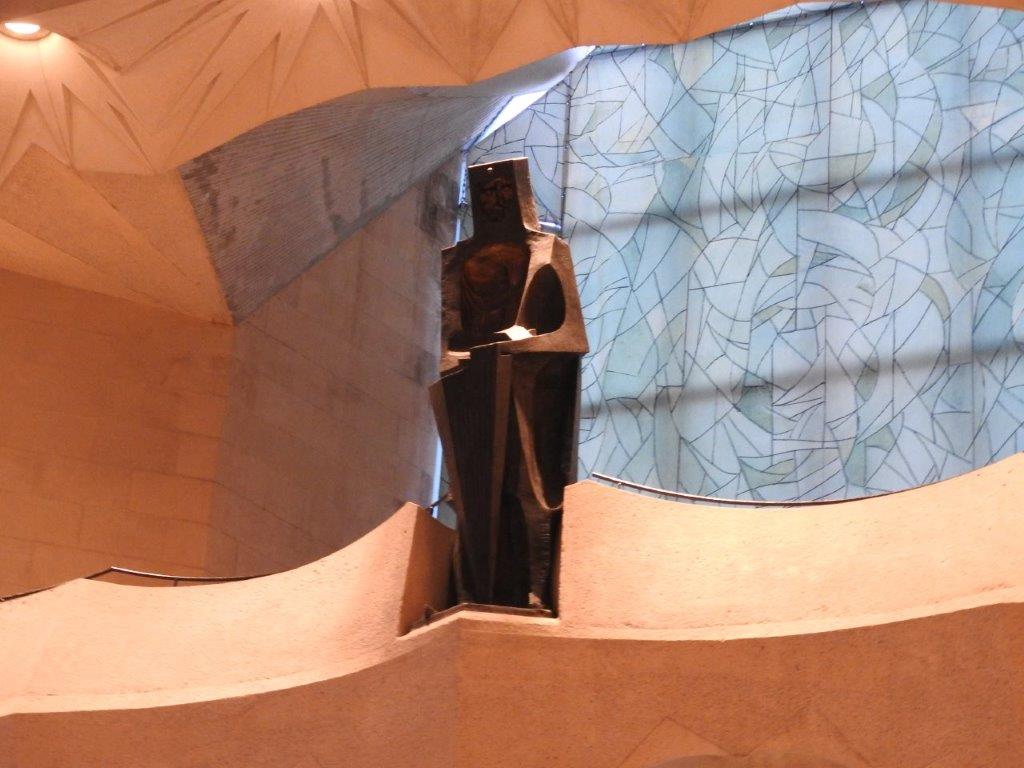 The outside is elaborate and gaudy, in complete contract to other places of worship in Barcelona, that are almost entirely unadorned (remember, no showiness or evidence of wealth). The eastern side of the outside is called the Nativity and the western side is the Passion. They are on opposite ends of the short arm of the cross that forms the inside of the temple (think of the crucifix). The nativity side has all the sculptures that make up the nativity, leading to Jesus’ life as a carpenter. It’s quite calm and very traditional. It’s also where we entered the temple. The passion side on the other hand is clearly about suffering and angst. The sculptures on both sides are intricate, accurate and realistic. With the audio tour describing so much of the detail, you could stand there for hours listening and looking. But we needed to go inside, which is equally as amazing as outside.