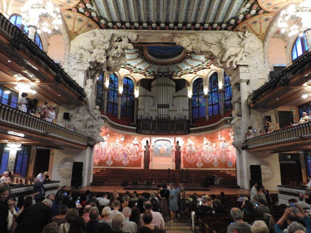 So, you want to know what the flamenco show was like? Well after a short rest at home, we caught the metro across town to the Gaudi-esque (not Gaudi) El Palau de la Música Catalana. The building itself is beautiful, both inside and out. As for the show, it was excellent, with 4 musicians, 2 singers and 3 dancers. It was a combination of singing and dancing and instrumental pieces. Of course the highlight was the dancing, both the pieces choreographed for all 3 dancers, and those for the solos. One of the women performed a dance wearing a gorgeous dress that trailed to the left, in a sea of ruffles. Her dance involved the train of the dress, which she danced around, flicked with her shoes and swished with her hips! I have no idea how she didn’t fall over! The male dancer performed a great tap show, tapping at a speed I couldn’t manage with my fingers! His feet and legs must ache when he gets home.