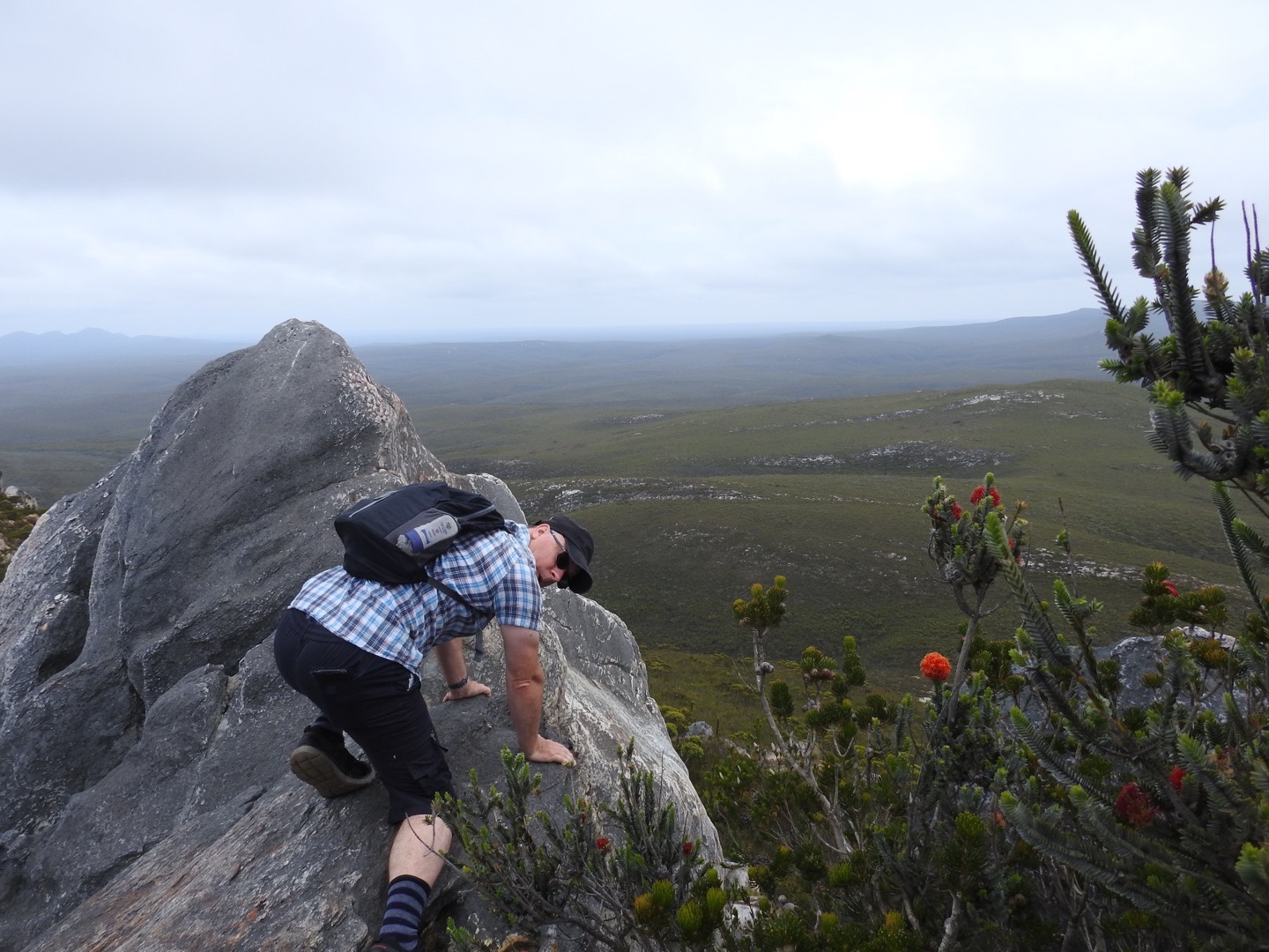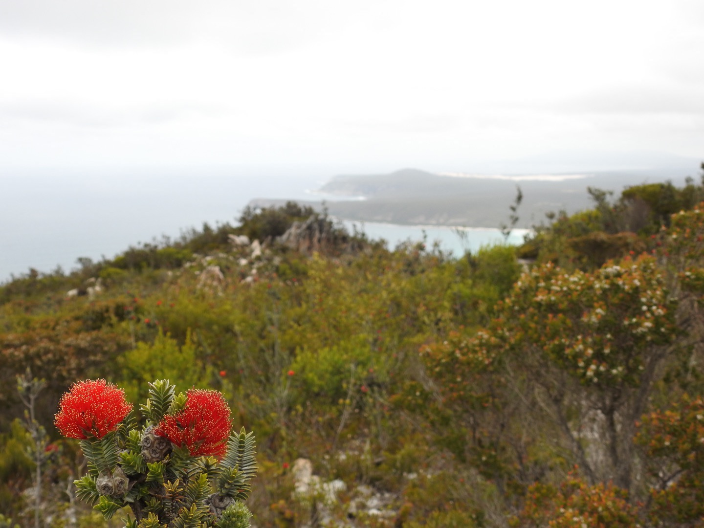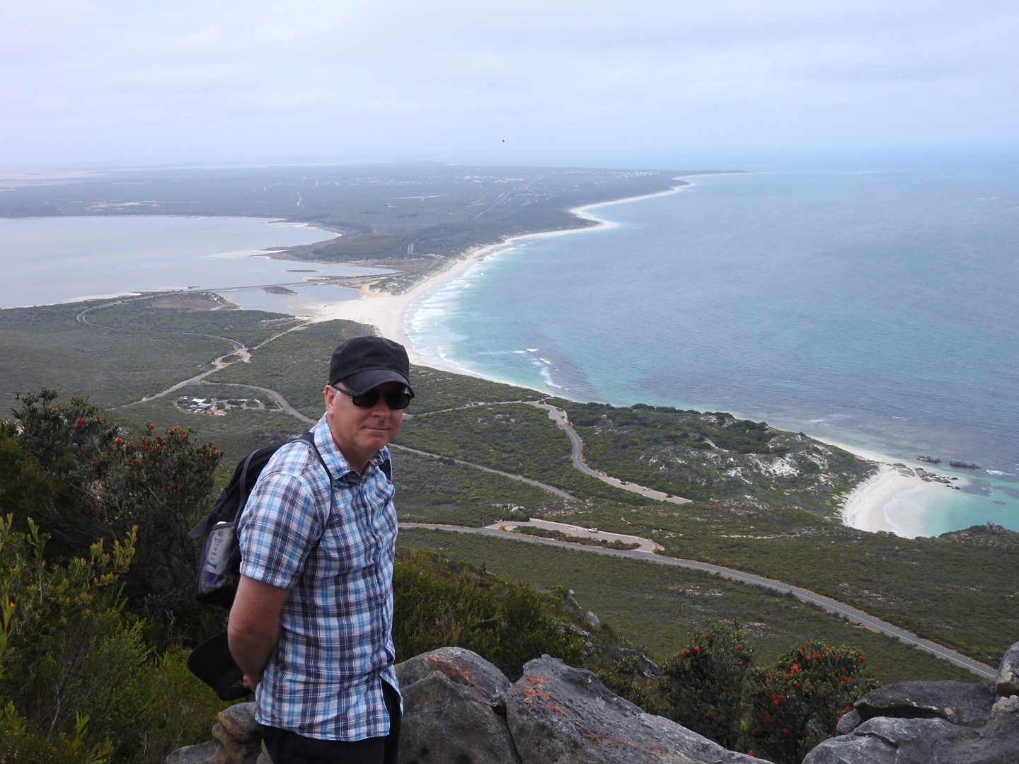 Having rested for a while we started our descent. As always I found the going down far harder than the going up but my walking poles were once again a great asset. What was a rocky walk up was a treacherous ball bearing style balancing act on the way down. But we did it, conquering East Mount Barren on a great day. At the bottom we spent a while admiring the banksia and congratulating ourselves on our achievement. The rest of our day was spent cruising along the coast to the west sussing out the beaches, Cave Point and Hamersley Inlet camp ground. Thanks to the overcast day we didn’t swim in the Southern Ocean but there is time enough for that.