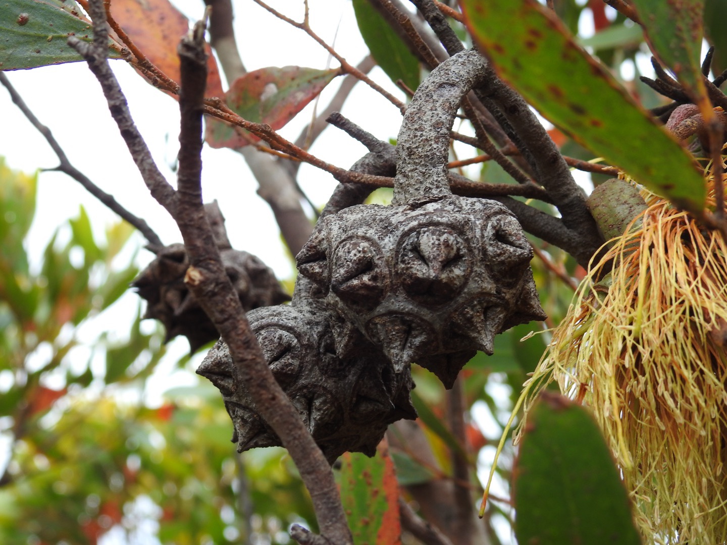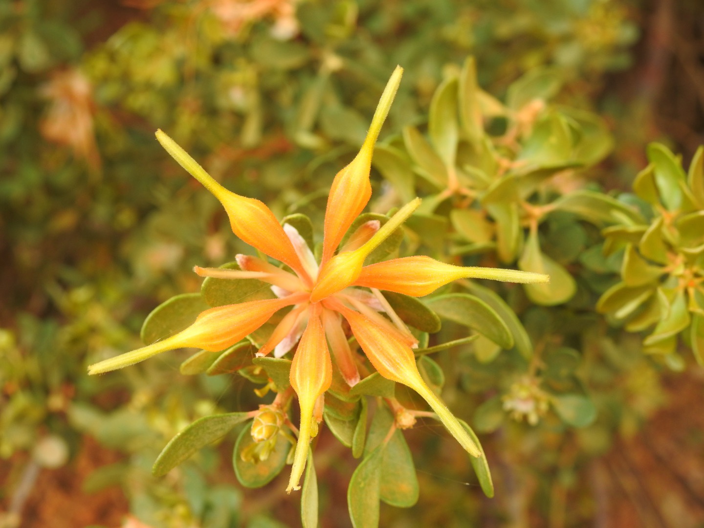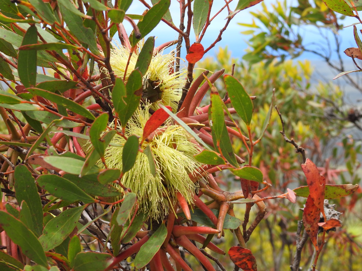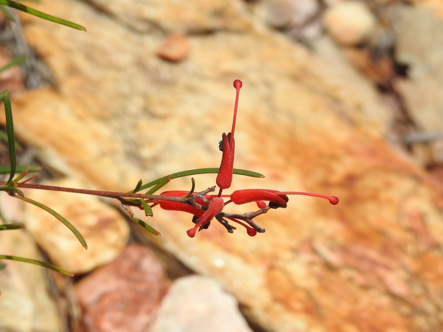 After a lovely breakfast looking over the lake we jumped in the car and headed towards the pointy topped mountain. We were forewarned about the corrugations from the online reviews and for the section within the National Park, they were gone rattling. So, in the interest of our safety and the protection of Maz we rumbled along very slowly, eventually arriving in the carpark at the foot of the climb. There were 2 other cars there, with one family setting off in front of us and a couple returning as we started the ascent. The first part of the climb is rocky but the gradient is quite reasonable. That doesn’t last long though. Most of the walk is straight up! Thank goodness for my poles. It took us about 40 minutes to climb up, partly because there were so many flowers and plants to admire. We saw fringed lilies, triggers, banksia galore, hakea, flowering eucalyptus and so many others I don’t know the names of. My favourites from today are the yellow thistle-like flowers and the yellow eucalyptus flowers that come from a bizarre red fingery pod.