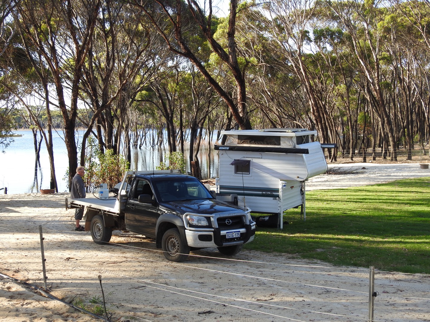 Moving day. So this trip is a number of trips within a trip and we are off today to our next destination. But first a big pack up, followed by coffee and cake, a food shop and a fond farewell to Hopetoun. We would definitely recommend a stay here over a few days, with some trips from town in either direction. The caravan park on the coastal edge is quite old but it’s certainly functional and our site could not have been better.This afternoon we have landed in Qualinup, near Bremer Bay, via Ravensthorpe and Jerramungup. The road trip was easy but for some reason the day just slipped away. We got here around about 3.30 and set up fairly quickly, before enjoying some homemade pizzas in the Weber. We are on a private property, listed through HipCamp. We are lake front, with the sun setting in front of us, the cricket on, a fire ready to start and a cocktail on the go. Do not disturb.