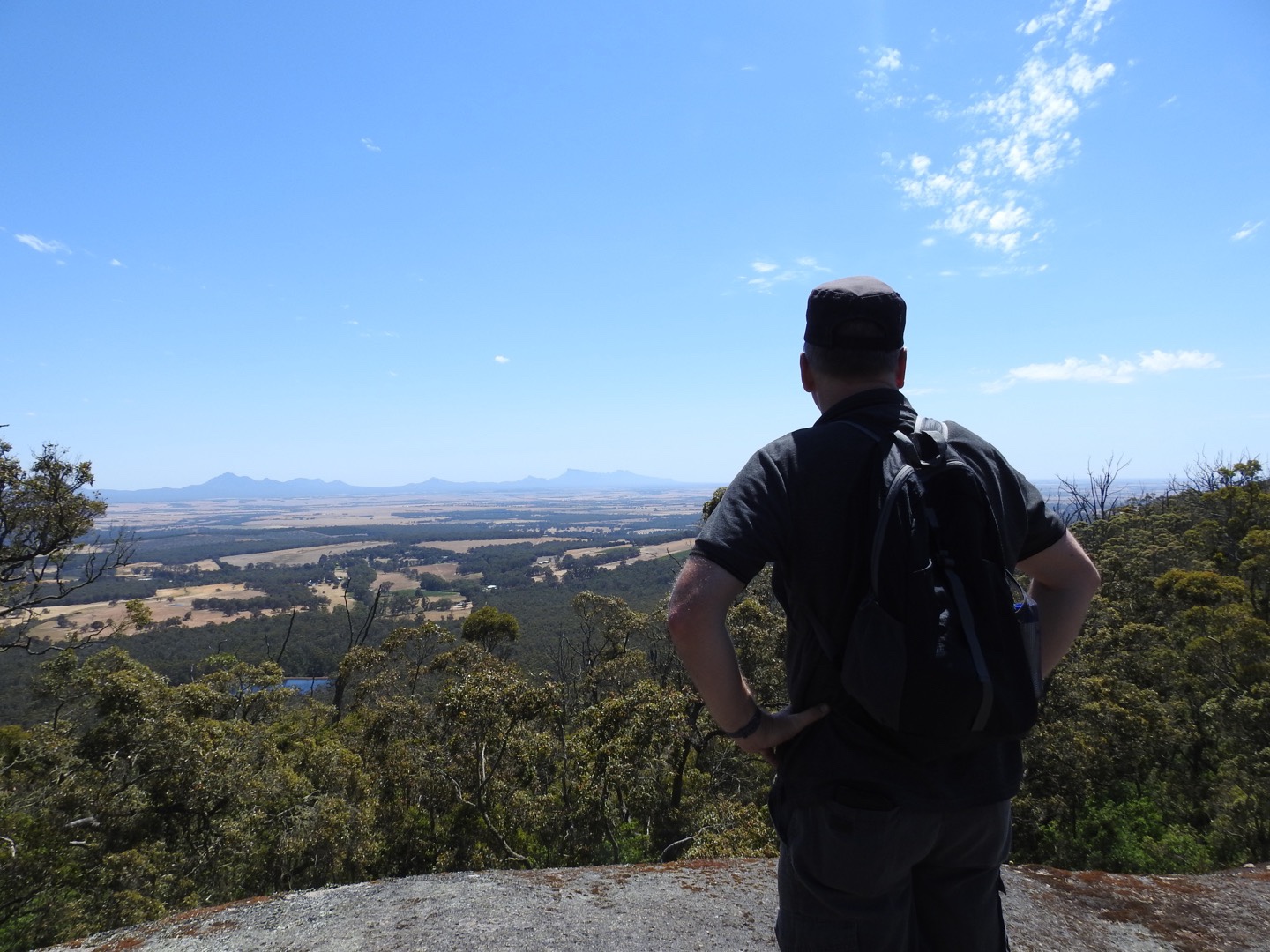 After a short recovery and a nice shower we headed out to Ironwood Winery, advertising “coffee and lunch”. With no information on their website to suggest otherwise, we assumed we would get something from the menu. We arrived at 2.10pm to be told there was no food available due to many visitors throughout the day. What the heck? You didn’t expect many visitors here? We were offered a wine tasting and subsequently felt obliged to buy some wine, making me even crankier. Very disappointed we jumped in the car and went for a long drive that looped back past the western side of the range. The day had completely cleared so we were able to see the point at which we had stood earlier, complimenting ourselves heartily!