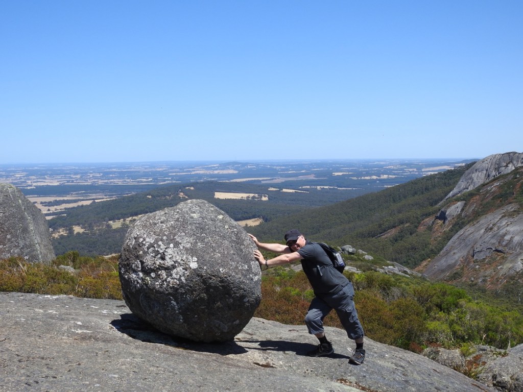 Having said our goodbyes, we headed west to the Porongorup Ranges. The decision was made to use the afternoon to walk up Castle Rock to the Granite Skywalk. The car park was very full so we headed to the very bottom, found a shady possie and munched through what was supposed to have been yesterday’s lunch, wraps with turkey, Camembert and salad. Yummo! We certainly needed the sustenance for the walk up the trail to the top. It’s a solid and steady climb, not as straight up as the Mount Barren pair, but at least as tiring. At the top there is a huge balancing rock that we of course tried to push over. From there the rock scramble takes walkers to the base of a very tall ladder. Have a mentioned my fear of heights? Do you recall my fear of the ladder in the caves at the Margs? Far out! I have done this before but I was still literally shaking in my boots climbing up this ladder today. The pushing, jostling crowd didn’t help. But I made it up there, only to be scared of the wrap around platform, with glass sides. Silly idea to go up there really, but it’s an attraction in WA and Mr P hadn’t attempted it.