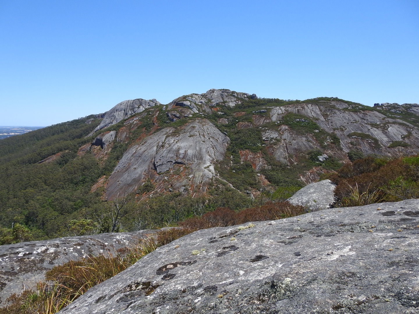 The Porongorups are proving to be an awesome place to stay. This morning after a relatively quick breakfast we jumped in the car and drove the couple of kilometres to the start of the Nancy’s Peak and Devil’s Slide walk. It’s the same place as the Tree in a Rock, very near to the CP. The plan was to tackle one and see if we could add the other at the end. We chose Nancy’s Peak and slowly but surely walked our way to the top of Hayward Peak. The walk is through divine forest, Karri, Marri and Jarrah trees towering above, and maiden hair fern and bracken below. I imagine the wildflowers are awesome here in spring. At the top we emerged into full sun, on a granite outcrop with a fabulous view of the Stirling Ranges in the distance. The sleeping lady looks so peaceful from here.