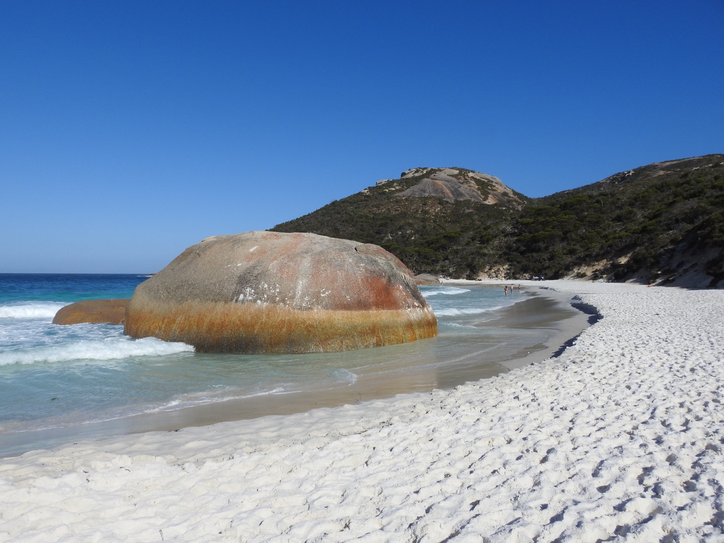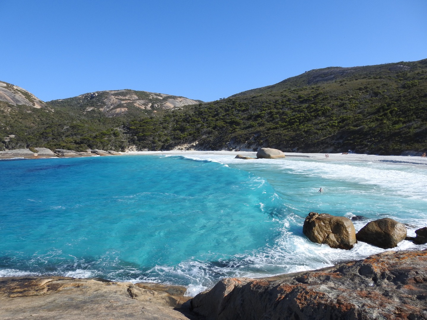 After that crappy meal we filled up our drinking water jerry and headed for the beach. Our first stop was Nanarup Inlet but it was jammed with wall to wall 4 wheel drives. We did walk down to the water and have a play with a Labrador before getting back in the car and heading for Two Peoples Bay. I can confirm there were a tad more than two people there but we headed down with our swimmers anyway. As it turned out, we were going against the tide with people leaving Little Bay as we chose a spot and got in the water. It was bracing initially but lovely once we were in. The water was crystal clear and although it was wavy, we had a good dip, body surfed a few waves and generally had a good time. Saved the day! We didn’t leave until it was almost empty but will need to go back to have a look at Waterfall Beach, which it turns out is just around the corner! Another one ticked off the top 50 anyway.