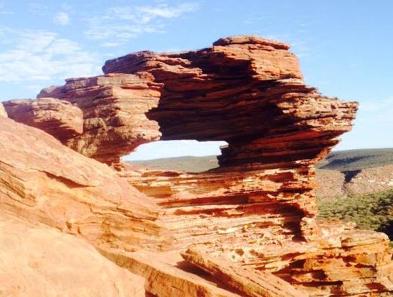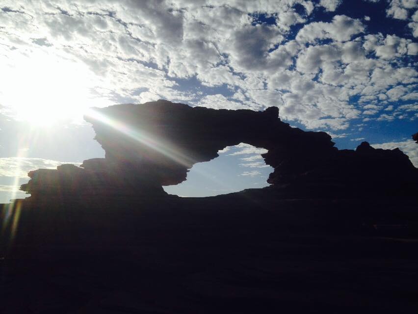 Sure enough, the car didn’t break down and no axe wielding murderer was waiting in the car park. In fact there was no one in the car park. The buzzing of a fly and the ticking of the cooling car engine were all that broke the silence. I wandered down to a Natures Window, far more suitably dressed than yesterday in jeans and hiking boots, and was awe struck to see the rock formation that is so famous. Amazing. And so peaceful. I looked at it, walked back and stared at it and then sat in it! Alone. For at least 10 minutes. There were half a dozen pelicans in a pool of water way way below to the west and a ‘roo having a drink directly below. Someone had fried an egg on the rocks yesterday but otherwise there was very little evidence of human activity. I am so glad I made it there and I thanked god for the opportunities I have in life and committed to be more grateful for everything. Just as I had had enough a young couple arrived and I left them for a few minutes alone with the rock hearing the hoards arriving in buses and cars. I timed that to absolute perfection.