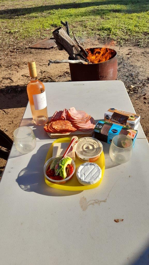 Time to head back to the campsite, plant some spuds in the fire and head off for a dusk cycle to the homestead while they cook. We have wanted to have a look at the site since we first came here last year. In my head it was a “homestead”. I imagined something rustic, old, inviting and charming. So off we went, cycling over hill and dale, passing emus and kangaroos. Mr P struggled on his almost decrepit bike, having tried to engineer it to be something it was never intended to be (think 12 volts and pedal assistance). I think it may be time we got some better-quality bikes for gravel roads. Although as the crow flies from the campsite the homestead is close, the tracks take you around a big loop, which is what we did. Once there, the site was uninspiring, certainly not the stuff that would stir Dorothea Mackellar or Banjo Paterson to write amazing poems! After a quick look around, we decided to re-trace our steps back to camp, as the sun was setting again. It looks like there might be a loop we could have done, but not in fading light. Maybe next time.