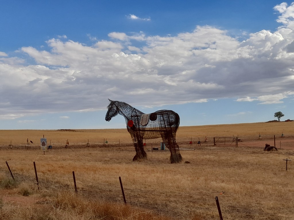 We headed out to Koorda after work on Friday. It wasn’t overly hot in Perth but the further east we got, the hotter it got out of the car, until it was pushing 40 around Northam. We missed a turn off and ended up heading out via Grass Valley to Goomalling along a back road, past a quirky looking property, complete with a resident wire horse. Man it was hot out there.