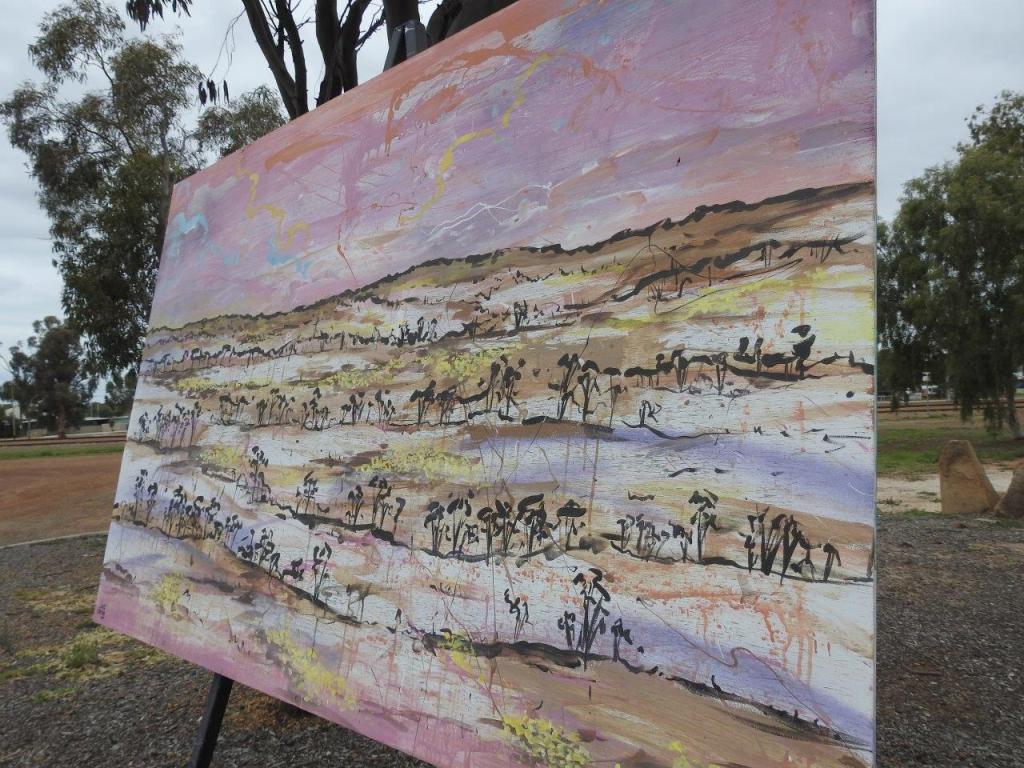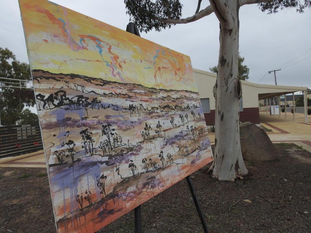 Sunday morning dawned damp from the rain, that annoyed the Jayco’s as they packed to head home. We were quite happy to dawdle, having a hot breaky under the awning. Packed up, with Tas back on Maz, we decided to head to the local art gallery, probably the only place besides the shooting club that we haven’t been. The gallery is in the old Anglican Church. It houses all sorts of art works including some from the local school kids. Well it is a gallery after all. I love to collect things from our trips so I was really happy to find a piece I like. It actually has pride of place at my front door, great img people as they come in.