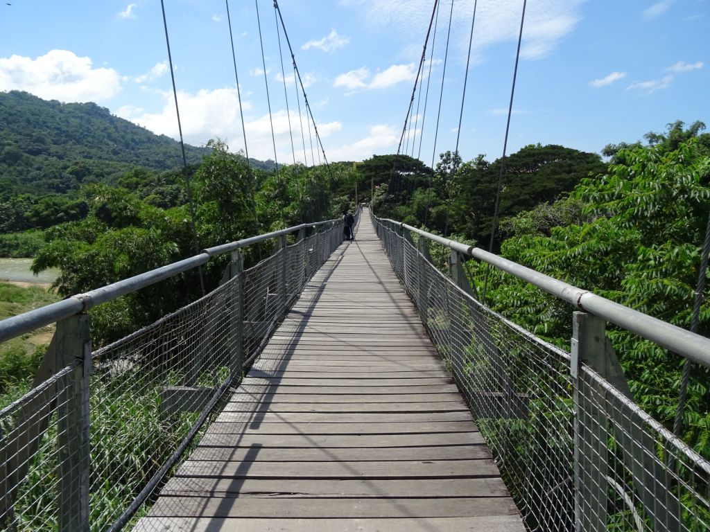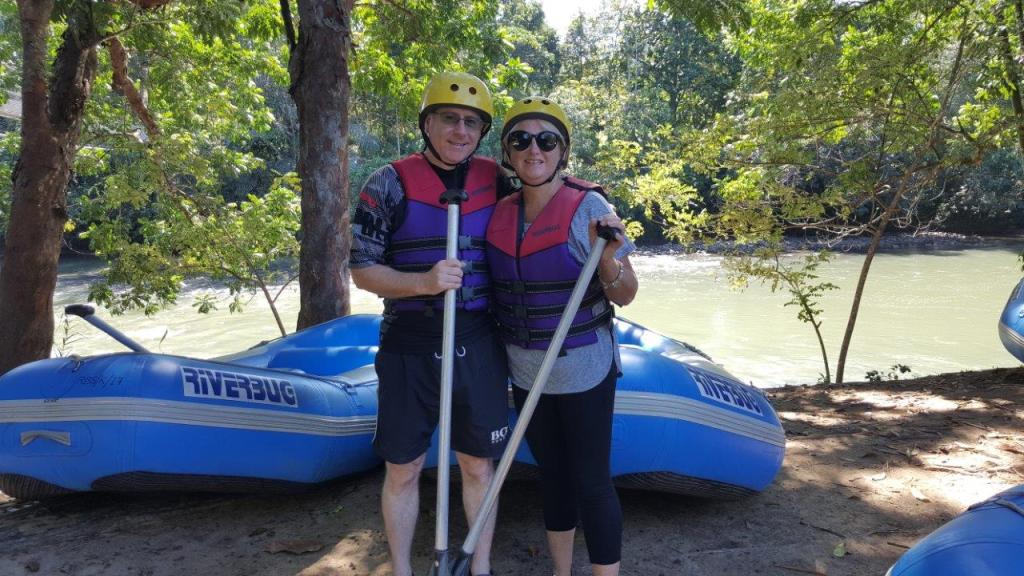 We arrived at the start of the white water rafting experience just as 2 rafts of people were leaving. Changing quickly into “something appropriate for rafting” we were on our way, ably support by Zil, a local young man. The water was a dirty brown colour from rain the previous evening but the surrounding trees and farms were very picturesque. And the paddling was a breeze thanks to the current pulling us down the river. The rapids were a class 1, so perfect for oldies like us and we thoroughly enjoyed the experience. Not too far into the 7kms we caught the other rafts and we all took the opportunity to have a swim. Back in the raft (no mean feat – “big fish”) we paddled on under suspension bridges that go to small family run rubber and pineapple farms. We even saw a scooter with a rider and a pillion cross one of the pedestrian bridges! All too soon the experience was over and we were having a nice lunch. We would both love to do some more rafting, hopefully a bit of a longer experience now that we have had a taster.