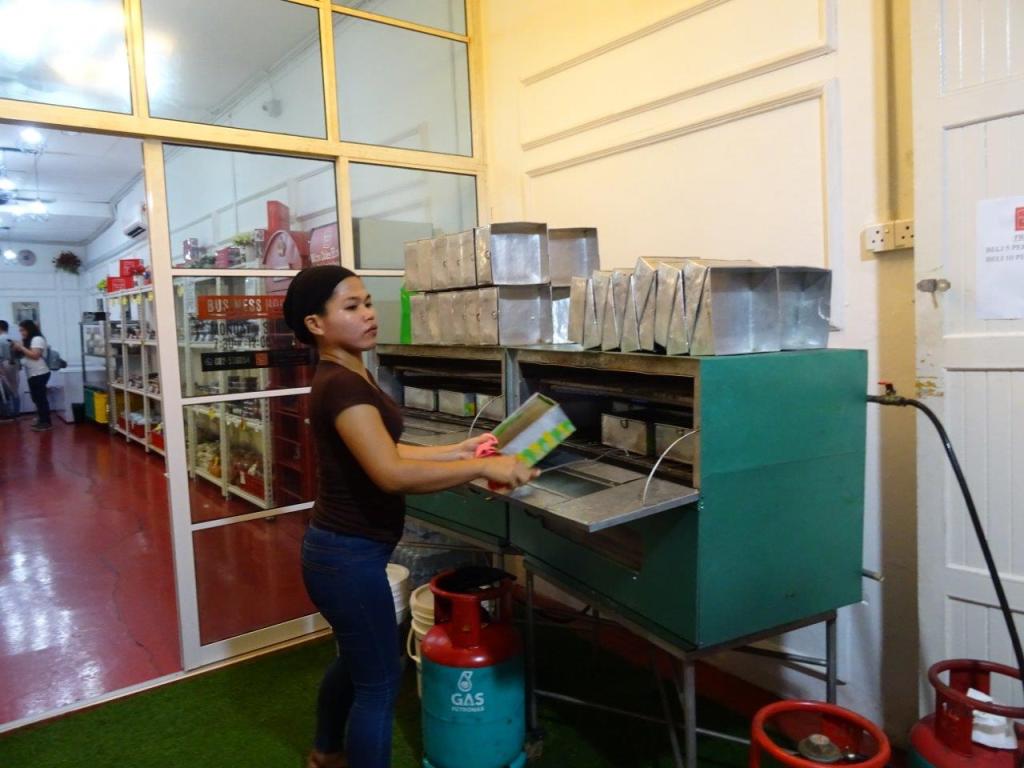 Further down the road we got another lesson, this time a visual one on cake. I had read about the famous kek lapis of Sarawak and wanted to get some to eat. The pictures show fabulous, colourful layer cake that look delicious. We were lucky to wander past a shop where the kitchen is on the outside and it’s possible to watch the baking process. It is highly labour intensive, with cake trays coming out of the oven so a fresh, thin layer of batter can be added before they are returned to the oven to set that layer, as the next tin is removed. And so the process goes until the kek is built and baked. I get that, it’s mostly straightforward, albeit fiddly and fussy. What I don’t get is how the checked kek is built! Of course I bought kek and of course it had shades of purple. Yummo.