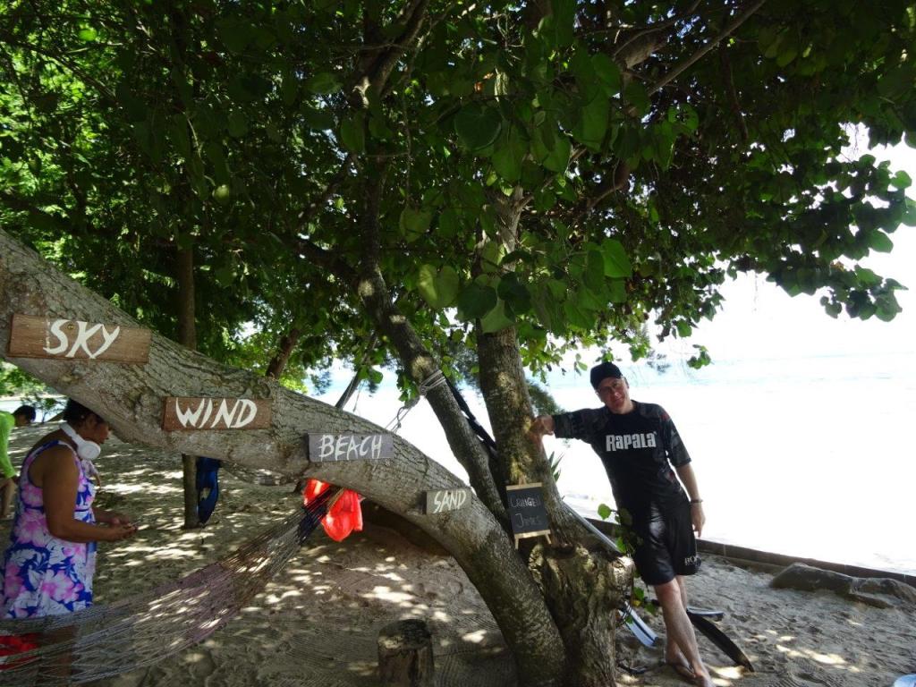 Although we arrived first, we weren’t the first to leave but we did get lucky and land up in a boat with a delightful guide called Abby. We motored a very short distance down the stream past a lazing crocodile (!) and across a shallow bar. Once at sea we travelled to the island, which took almost no time. Once there we basically had the opportunity to do whatever we wanted. The choices included kayaking, snorkelling, resting in hammocks or deck chairs, or buying some extra activities like paragliding. So what we paid for was a day on a private island. Mr Bolo and I really booked it for the snorkelling so we donned the mask and snorkels and headed out into the warm water. We spent the first hour and half in water waist deep and in that time found clown fish dipping in and out of the anemones. We also saw many other colourful fish swim between the sea weed and coral. Speaking of which, there were brain corals and others that were branching and bushy. Given the depth of the water and how close we were to the beach (25m) what we saw was amazing. And Mr Bolo saw his clown fish!