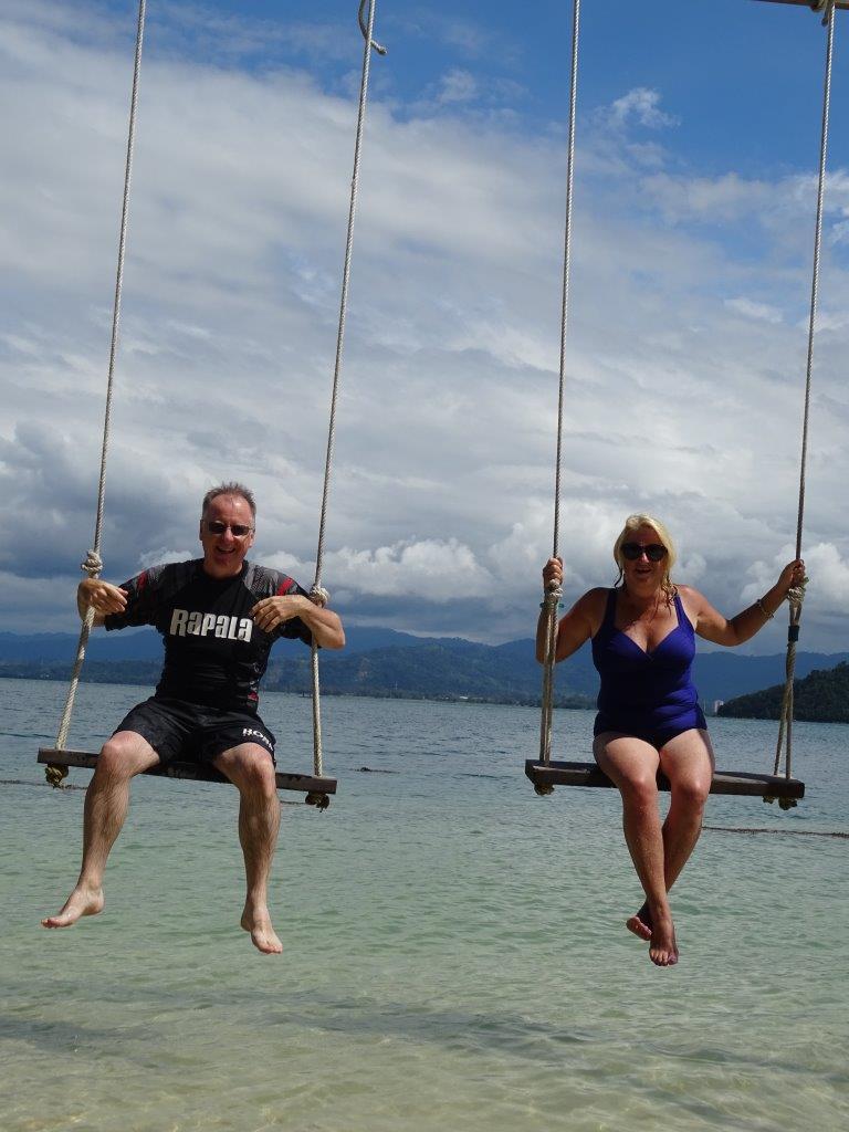 After lunch while we waited to go to the reef for the planned snorkelling we had a little turn in the see-through canoe and tried the stand up paddle boards. Neither was hugely successful but a bit of fun. We also tried to pull off a timed photo on the swing that hangs over the water. Mr Bolo wasn’t able to get his butt up to the seat before the time ticked over but it certainly was entertaining.