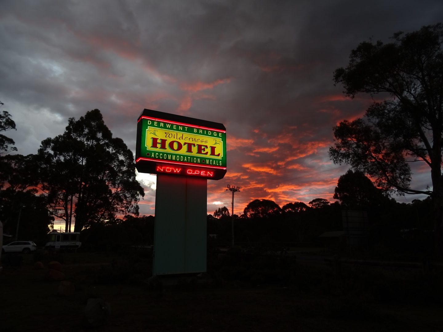 Following our cruising in the boat we cruised off in MazStar to Derwent Bridge via a devastated Queenstown. This part of the country is severely scared by mining and had some horror stories of its own to tell including the Mt Lyell fire where so many men (and perhaps a woman) lost their lives underground. Eventually we completed the curly road trip and made it here to Derwent Bridge and had a drink in the bar. We are camping the night here in the car park with the wallabies and mosquitoes. The sunset is fabulous, the road is quiet and the amenities will more than suffice. Good night!