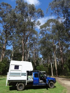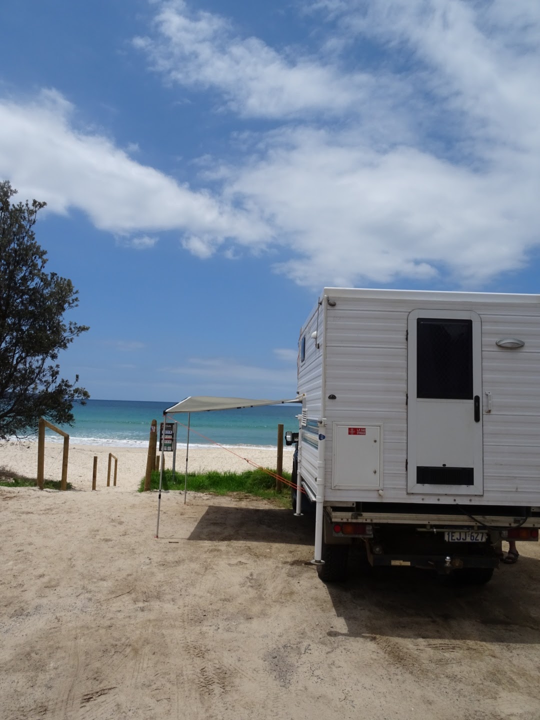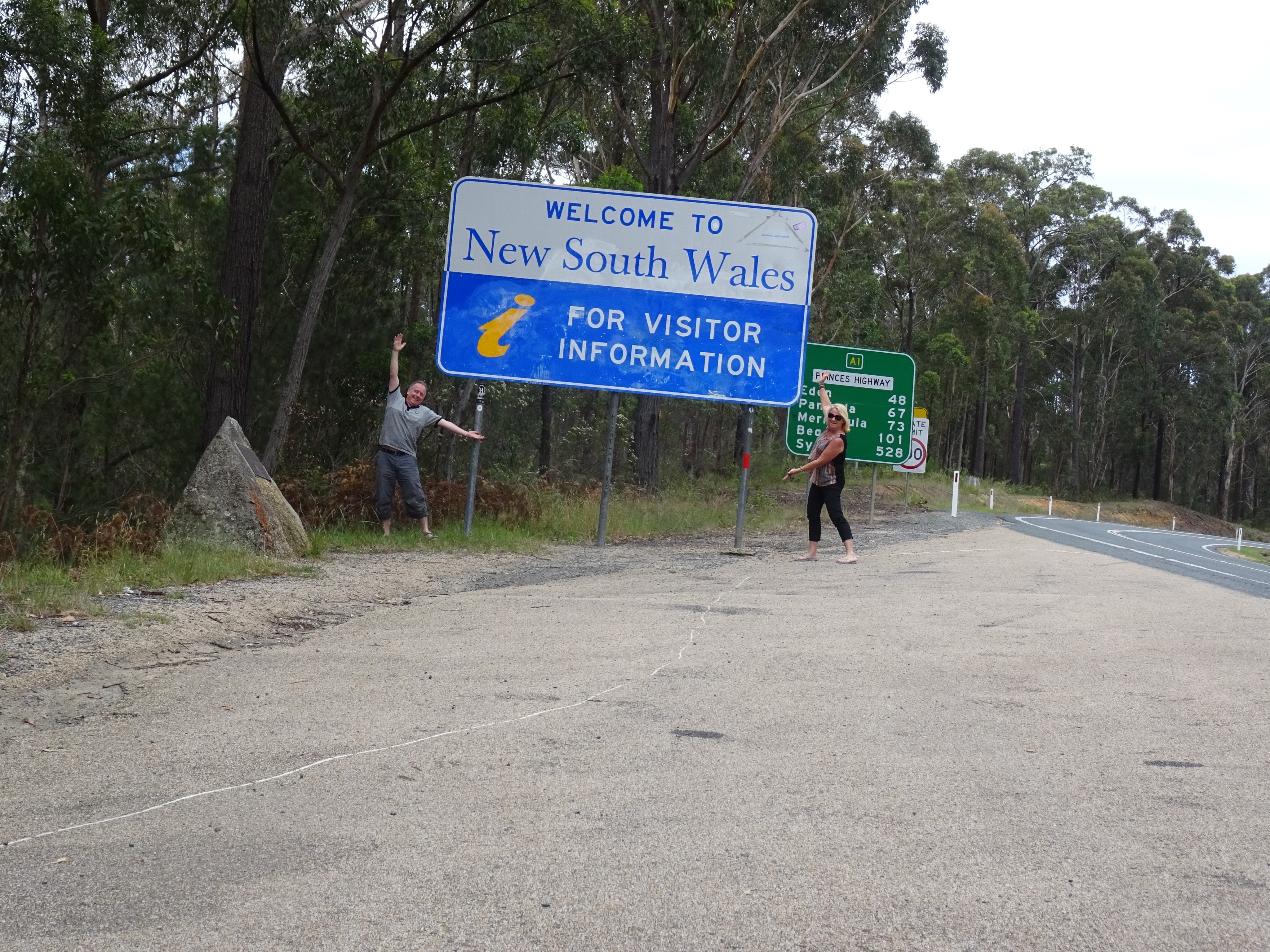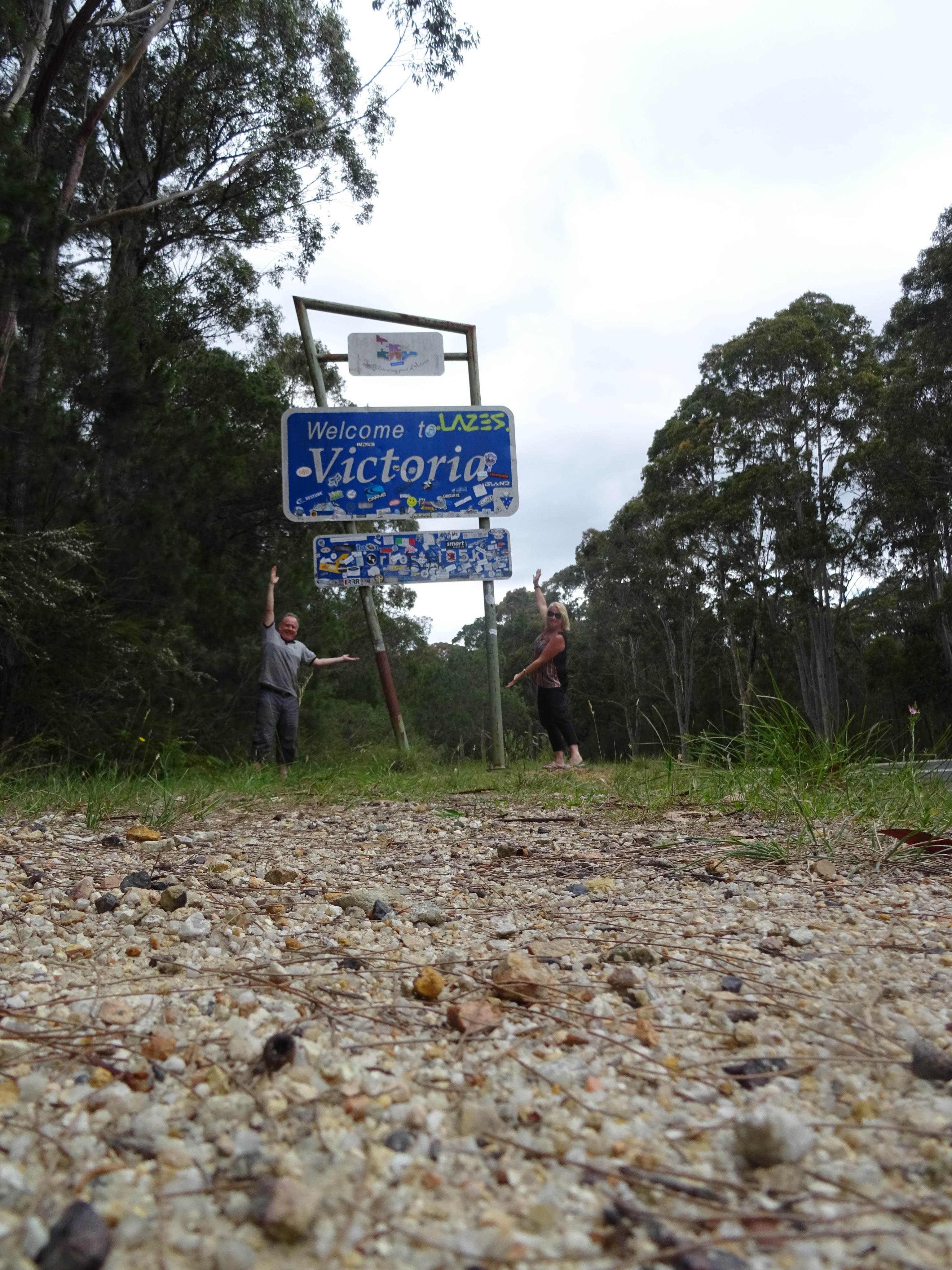 We hit the road and made for Merimbula to arrive at a sparkling beach in a wide bay with clear water. After a little walk we cruised to Pambula and enjoyed a gorgeous lunch of cheese and chutney and crackers from our Tilba shopping spree, with a beach view. Apparently it was prime real estate. We certainly thought so too. Next stop, a quick shop in Eden and a quick lookout (!) over a pristine inlet before crossing the border (with the obligatory photo stop). The Newby will soon get used to me yelling LOOKOUT!!! every time I see a lookout sign. We then chewed up a good few kms to arrive in Cann River 24hrs later than intended! The photo at the top of this page is Maz parked in among the gorgeous tall trees of the abandoned but functional caravan park. Heres what I wrote about it on wikicamps: Absolute carcker of a spot! Off the highway but we didn’t notice the noise. Clean amenities, emtpy bins, mown sites, taps and sink. Unmanned PP – freebie. No hot water or power, Good tent sites behind well placed logs to avoid being run over. Picnic tables. You can get a lot for nothing sometimes.
