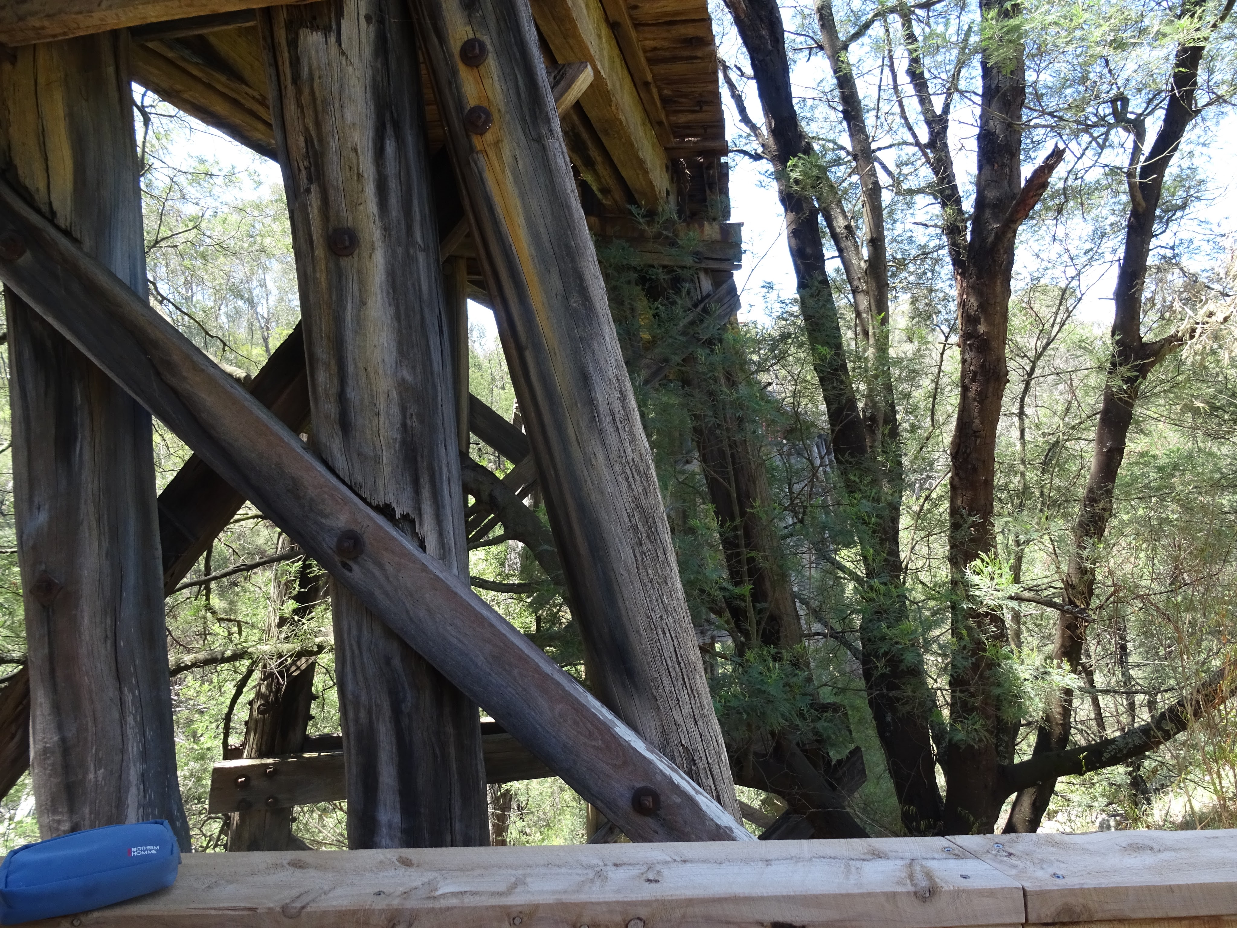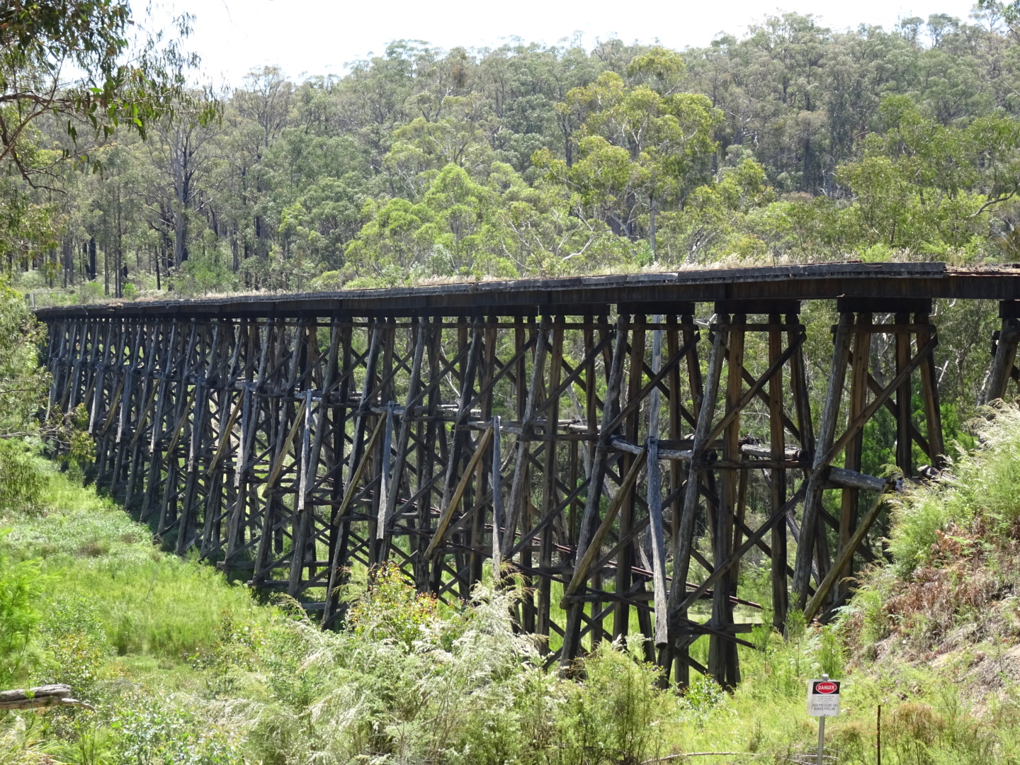 The bridge was apparently built in 1916 railway from Melbourne to Bairnsdale was extended to Orbost. This 97km Bairnsdale to Orbost extension through rugged terrain was reputed to have been the most difficult rail project undertaken in Victoria. The construction of the bridge utilised materials available, milled and put into place onsite! Apparently it was used for 60 years but was damaged by bushfire in 1980, with the last train crossing in 1987. It is an impressive 247m long and 20m high, and is the largest standing bridge of its kind in Victoria and rightly is listed on the Register of Historic Sites. The materials include red ironbark and grey box timber that have stood the test of time. I wouldn’t want to travel on it now but its easy to stand there and imagine what it was like when I train crossed over the chasm underneath. I daresay it was scary to be on board the train. I should conclude by saying that we still have a soft spot for the other bridge back in Nowa Nowa.