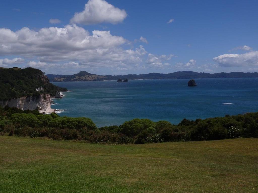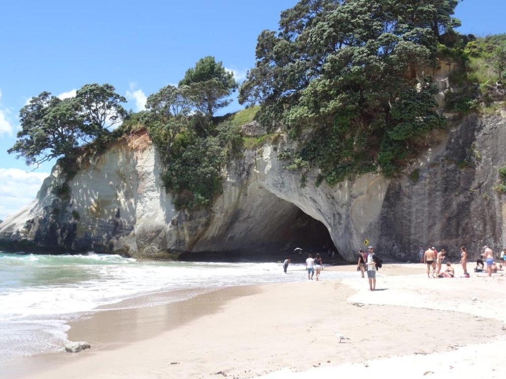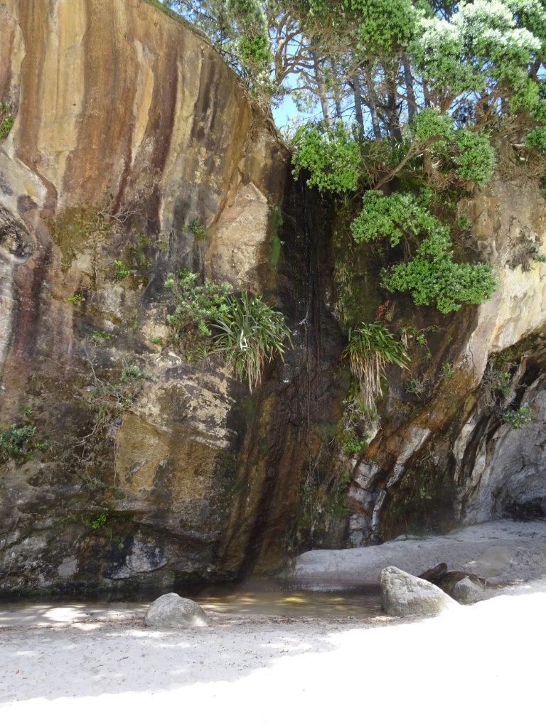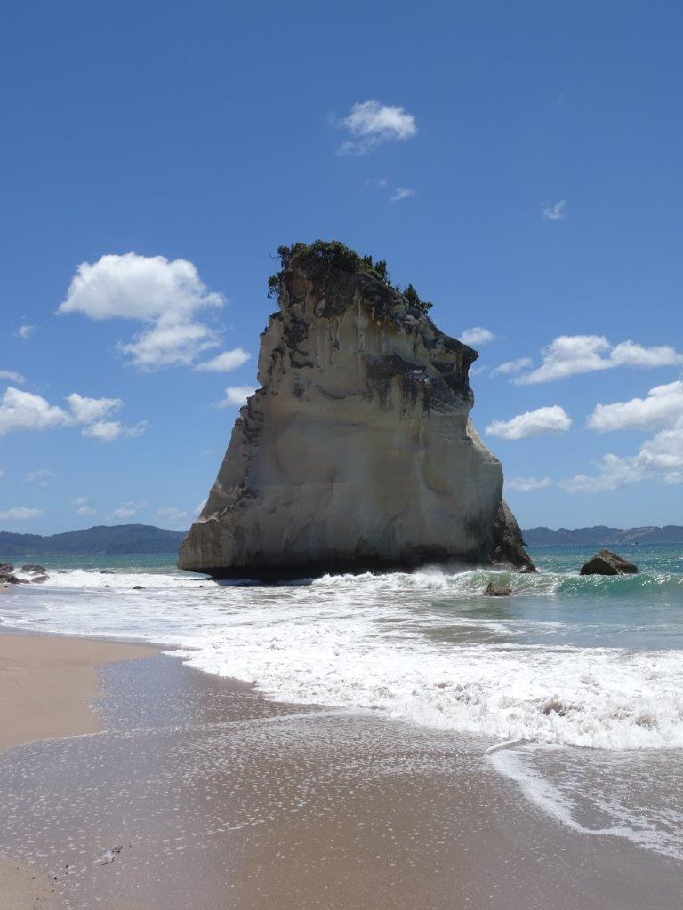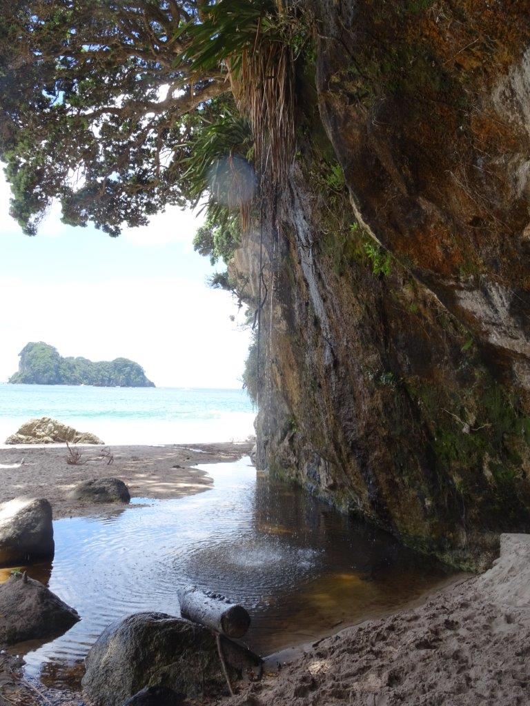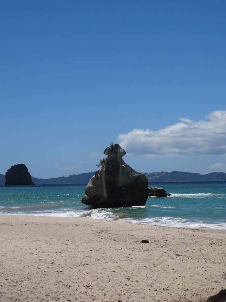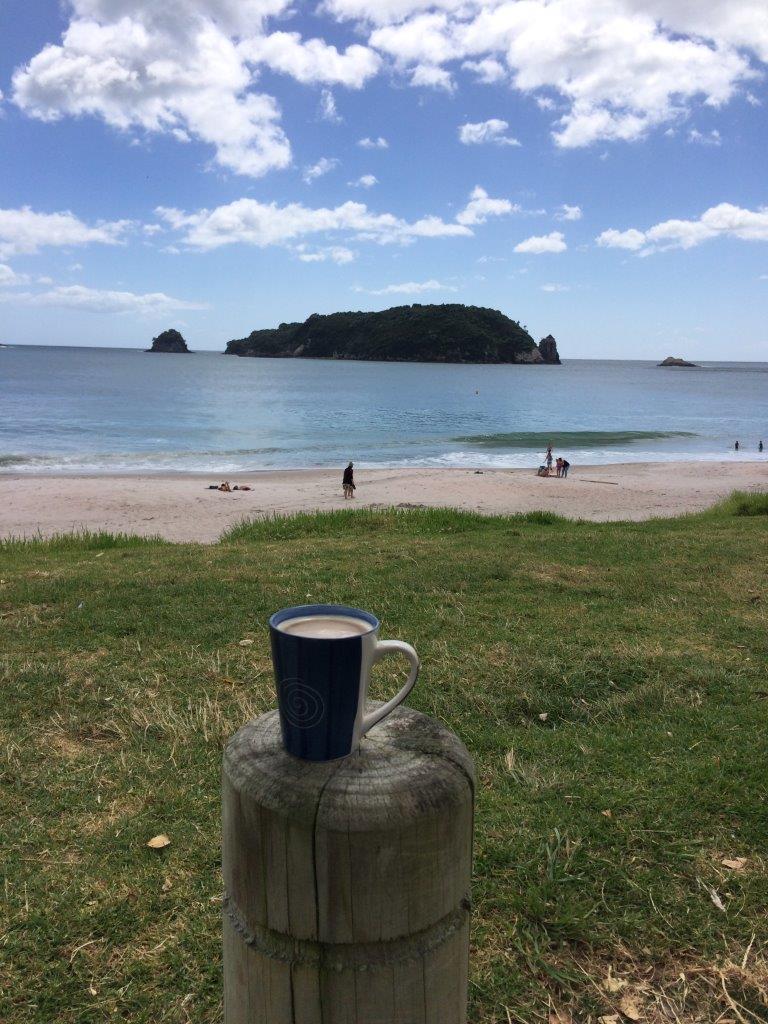 The only problem with caravan parks is the 10am check out time. If I ever run a caravan park I’m going to change that to 12 midday. Let’s face it, if you arrive in the evening and leave in the morning you are lucky to get 16 hrs in the park. Perhaps you’ll have one shower each, top up the water (more likely once every few days), plug in the van to recharge the battery, and leave behind one bag of rubbish. The average cost of a site is $40 (NZ) but varies from $35 to $55. Anyway, we made the 10am check out and hit the road more relaxed than yesterday and headed for Hahei Beach for a coffee. This was our first experience of NZ’s blue water, white sands, warm days and cool forests.