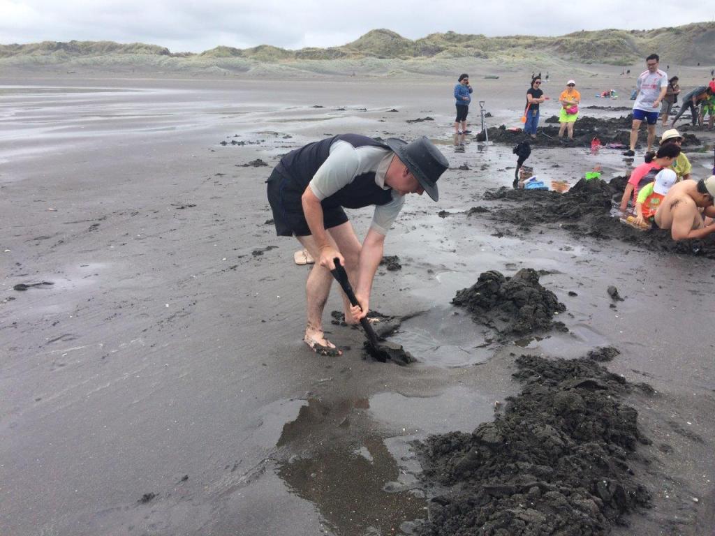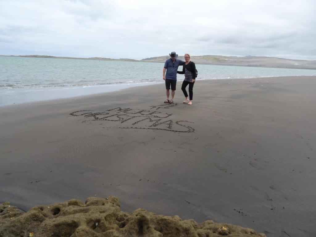 Dry and warm we headed for our overnight stop in Kawhia. The drive there is windy and hilly but pretty. We arrived to our caravan park late but were met by the nicest of park managers who helped us onto the site, gave us the lowdown on the things to do and see, and offered us a shovel for the beach tomorrow and the opportunity to return to the park to shower and change afterwards. Being Christmas Eve the festive spirit infused the park and we had a pleasant, if cool walk around the foreshore before a lovely dinner and drinks.