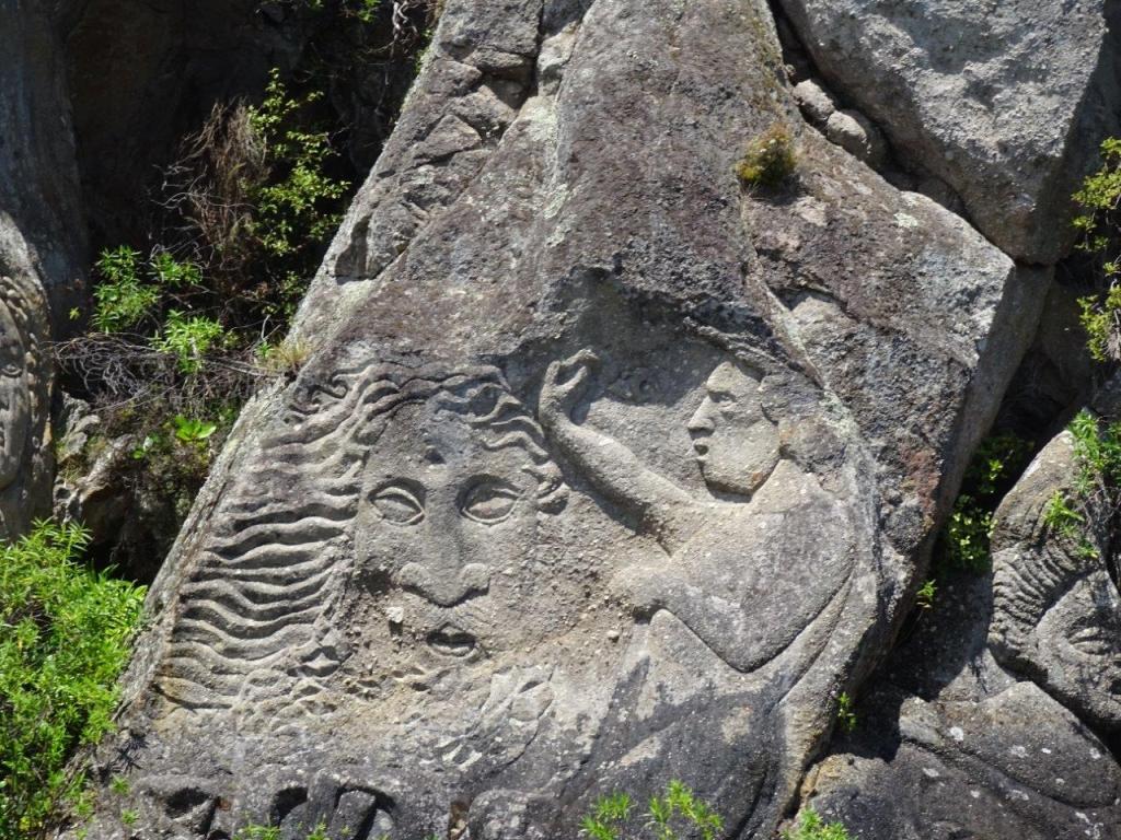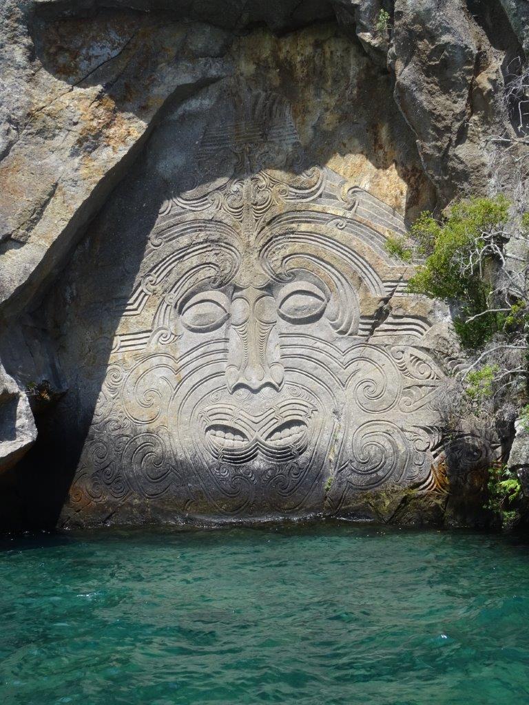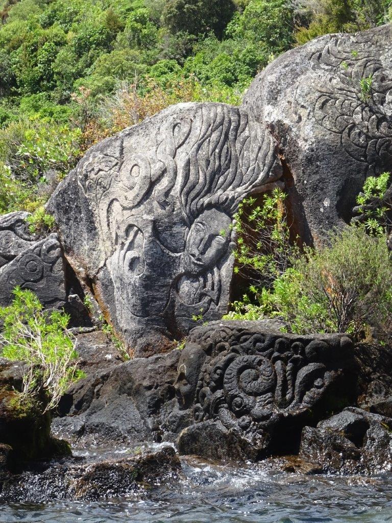 Having satisfied my lifelong desire to see the mud and geysers, we could leave Rotorua happy. Having run out of time the day before though, we had a drive out to the blue and green lakes. Both are beautiful and perhaps staying at Blue Lake caravan park would also be a good option over Rotorua proper. Our main plan for the day though was a much anticipated sailing trip on Lake Taupo. This was another pre-booked attraction and something I was looking forward to. I have to say the whole experience was amazing. We arrived with more than enough time to have lunch in the camper before organising ourselves for the sail. Smartly we grabbed a fleece each and put on long pants, socks and shoes. We boarded bang on time and left the harbour in the safe hands of our captain David and his international deckhand. Mostly we motored from the north in a southerly direction although there was some time under sail. The edges of the lake host some lovely homes and other beautiful scenery and we enjoyed looking around. The destination of the sail is the carvings. We rounded a bay in the lake and found the carvings with the afternoon sun shining perfectly on to them.