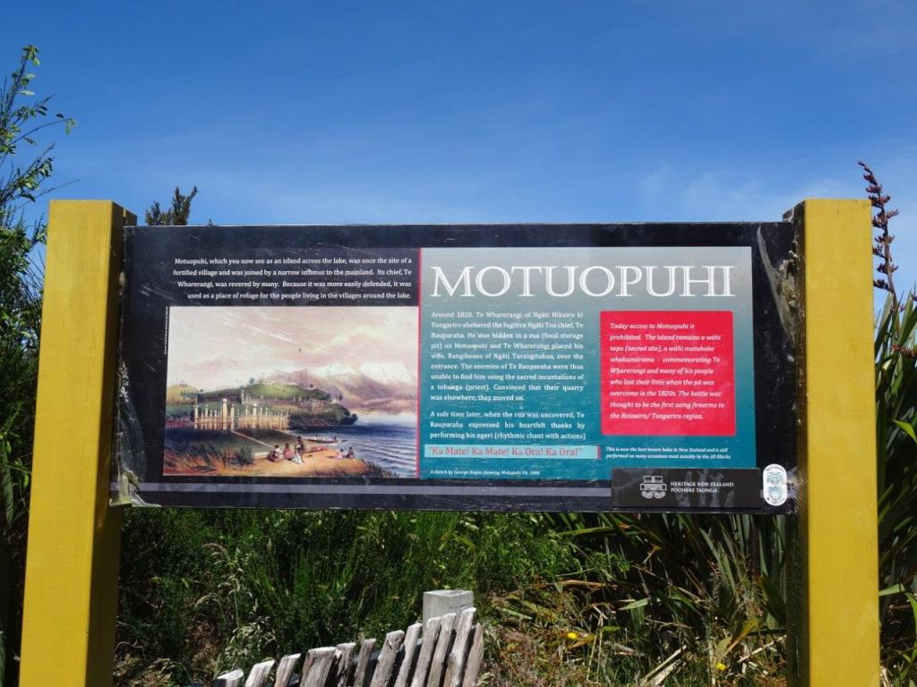 Our first stop was the lookout from the south of Lake Taupo for a quick cache but also a last glimpse of Mt Tauhara (that looks like a lady lying on her side). Chasing caches we drove past the masses at various spots and instead stopped at a spot that the app informed us was a Maori archaeological settlement site. What a cool spot. Right at the base of Mt Tongarrio and across Lake Rotoaira. Why did we think it was cool? Well, the view of Mt Tongarrio is fabulous. You can see a steam vent and some residual summer snow. Then there is the view of the lake and the island on it. Of course the place is steeped in history, the most exciting of which is that this is the home of the haka. And everyone is driving past it!! Here’s how the story goes … the island was a fortress for a group with a chief that everyone liked. Unfortunately folk took advantage of this and also went there seeking refuge. One such fugitive hid so well that his hunters left without their quarry despite a thorough search. When finally he emerged from a food storage pit he did a rhythmic chant with some great moves, with a chorus of Ka Mate, Ka Mate. If you don’t believe me, check the fine print on the picture. What a cool spot that is preserved and rightly protected for the future.