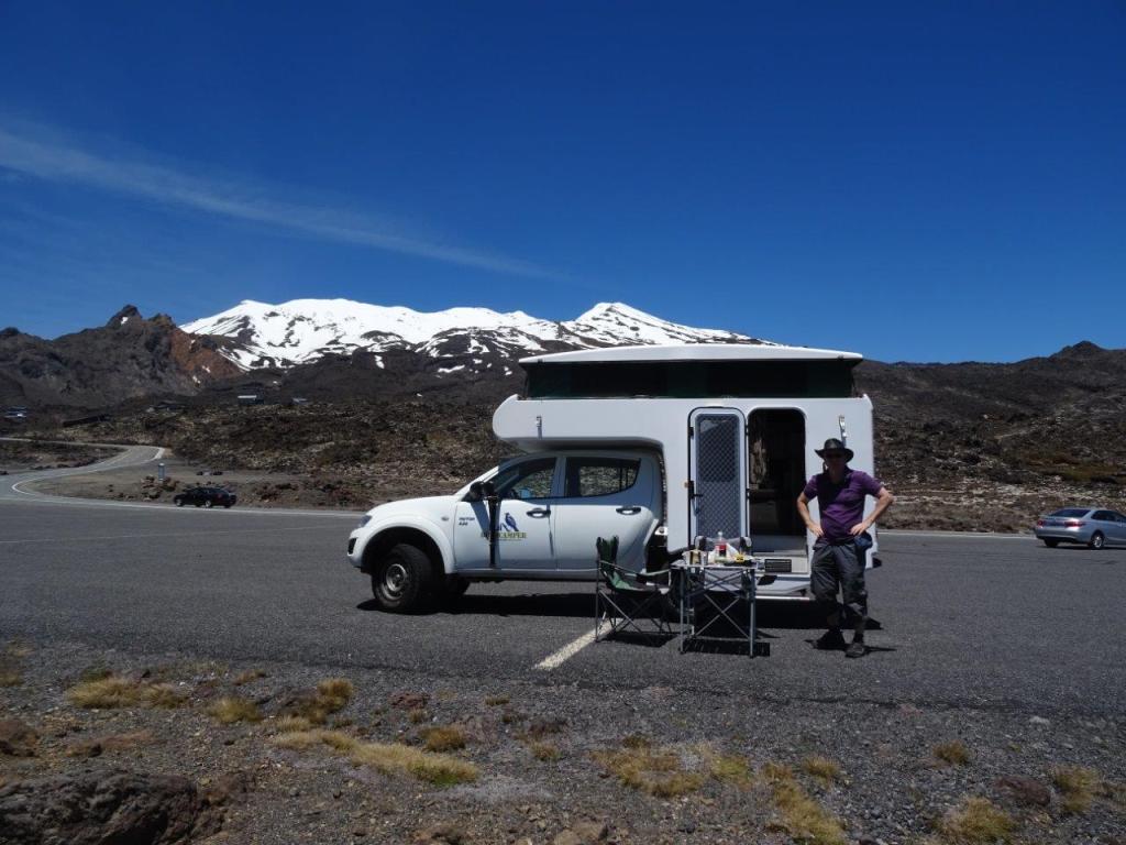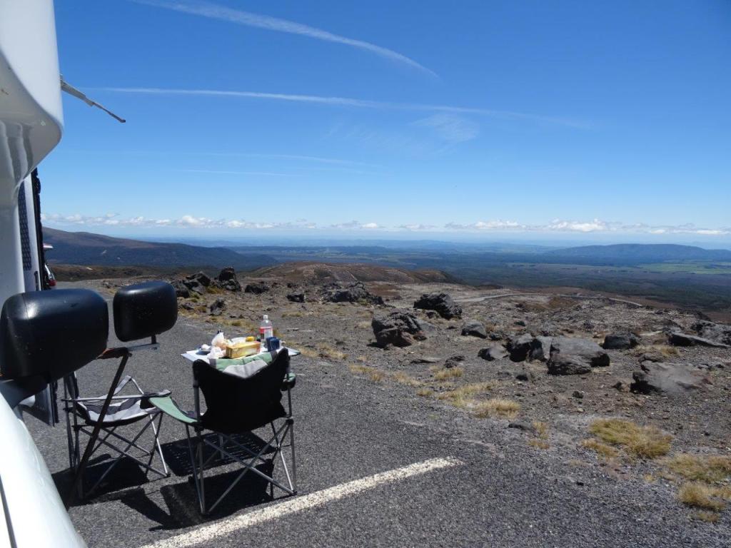 Our next stop was roadside to try to get a selfie with Mt Ruapehu. The picture wasn’t hard but balancing the camera, running into the shot and looking half decent was! Now if you look back through my travels you’ll see that I spent last summer in knee deep snow. Mostly I was OK with it, but the thought of snow on another summer was doing my head in. So needless to say, despite how fantastic the view looked, I was none to impressed with the idea of snow again! Nevertheless we decided to drive in to and through Whakapapa (too busy) onto Mt Ruhepeo for a look and some lunch. There is some tourist friendly stuff to do up on the mountain in summer but we were happy just to have a look. From the western side of the mountain the view to Mt Ngauruhoe is fabulous. This is the classic looking volcano shape and you can imagine it erupting and spewing lava into the air! This side of the mountain also gave us another fine lunch spot and we enjoyed a spectacular view with coffee and good food. The luxury of having your kitchen with you everywhere you go cannot be understated. This trip has seen some amazing lunch locations so far, with more to come.