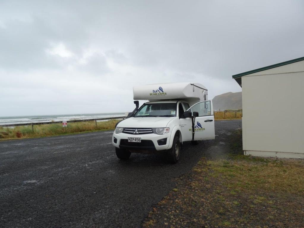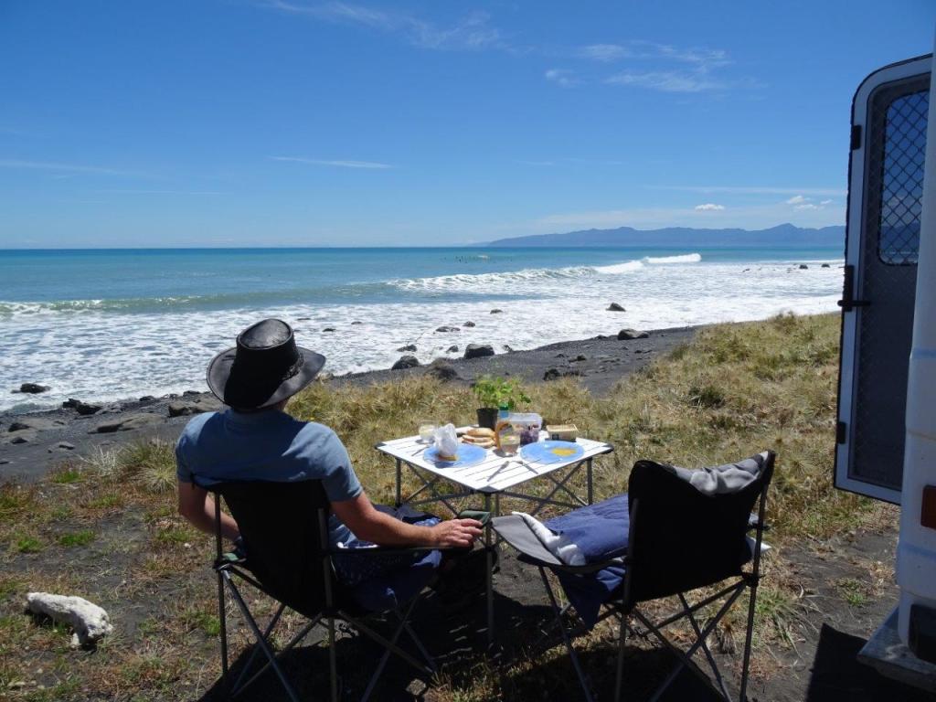As I said earlier, today and tomorrow are unplanned so I decided to drive (for the cars sake) and left him to find us accommodation for the night. The plan with this trip originally was to hire a vehicle that was not too big and would give us an idea of whether we would like to own a slide on camper ourselves. Between the planning and the actual holiday, we bit the bullet and bought our own anyway. But the other part of the plan was that the camper we hired was significantly cheaper than a true motor home so we could afford a paid campsite each night. Quite frankly, when I’m on holidays I don’t want to deal with a toilet cassette. I’m a nurse. I’ve dealt with human excrement enough to last me a life time. Anyway, back to the camper. Its small inside, with a full size bed, a kitchen sink, two burners, a fridge and some poorly used storage. Having a dual cab car we decide to take a side each of the back seat for our luggage which meant we didn’t need to move our stuff each night to go to bed. There is no TV and few windows but we like to live outdoors as much as possible so the space is really for sleeping. We also are not big TV watchers and would rather go for a walk in the evening. But today was a huge day and so The Newby didn’t have too many requests for tonight’s site. The weather wasn’t looking so fine so we headed for a place with a deal on and parked the camper at Foxton Beach for the night. Back on the west coast of the North Island.