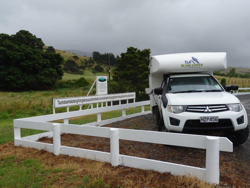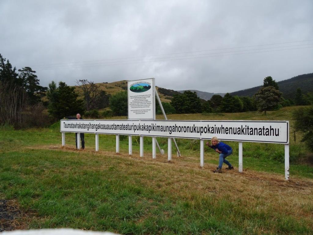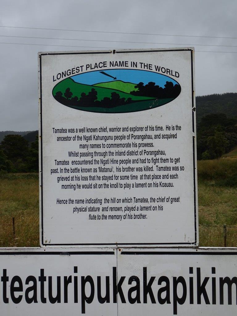 Then, as we suspect we won’t find it, we come across the road sign to “the world’s longest place name”. Obviously those few words are easier to fit on the road sign, and with that we’re off in the right direction again. A couple of bends and here we are at Tetaumatawhakatangihangakoauaotamateaurehaeaturipukapihimaungahoronukupokaiwhenuaakitanarahu. I hear you asking “what is there”? Nothing. Well not nothing. A very big sign, a geocache (should have thought to check the geocaching app for directions) and a big hill. And rain. But what a fun place to be!! It was so worth the whole day in the car (by the time we got to Martinborough tonight) and we hung out at the site for at least half an hour. The story goes that the place name is a Maori word meaning “The place where Tamatea, the man with the big knees, who slid, climbed and swallowed mountains, known as ‘landeater’, played his flute to his loved one”. No wonder there are so many letters! There’s not much else to say that can’t be said in that description, but my picture shows a sign above the place name that adds a bit of detail. Getting the whole sign in the picture meant the camera had to be rested a fair distance back, making the run in to the picture a bit harried. I should say pictures, had to make a few attempts to get the right one.