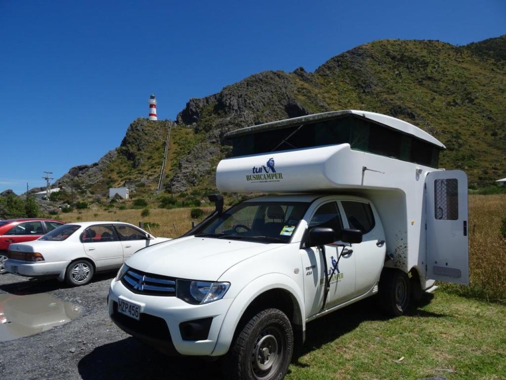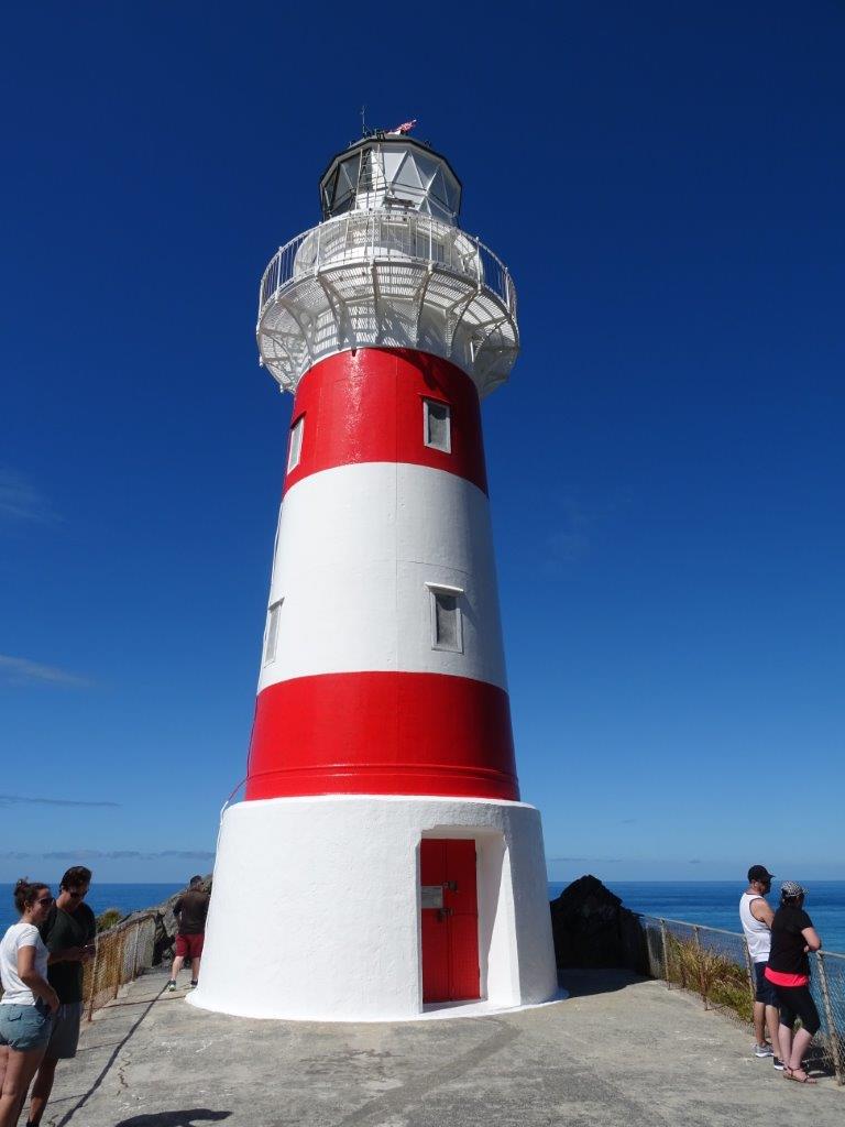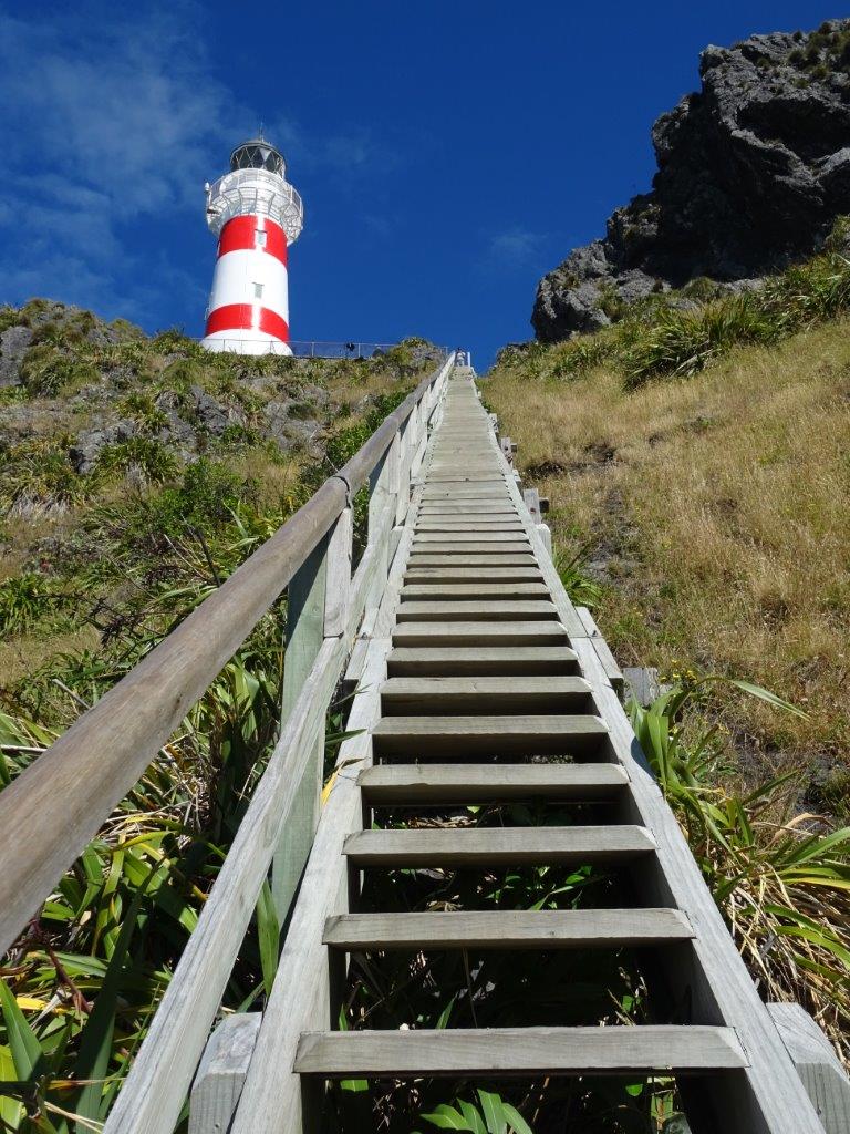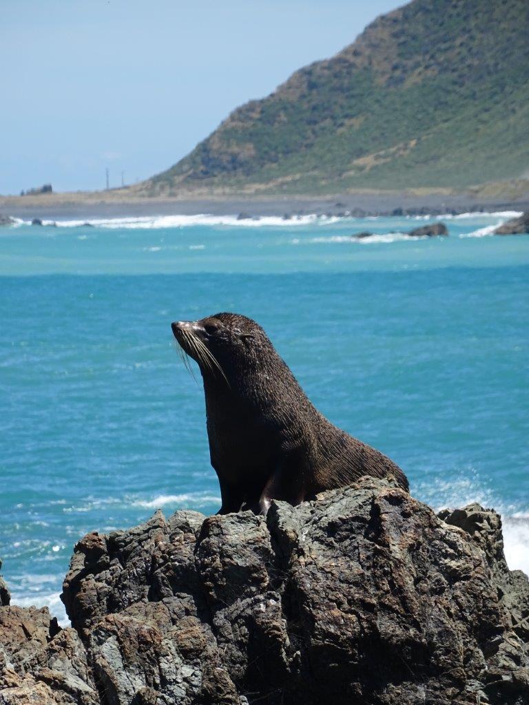 Eventually we arrived at the end of the road, signified by some animal skins hanging from the gate. My skilled parking allowed us to have the door open away from the rest of the cars in the car park and me to pee without prying eyes. It also meant that the mint could be left out to sun without fear of being stolen, although the seagull was not too sure who the other bird was on the fence post. I was really, really hopeful of seeing a seal or too, so I took the opportunity to ask a passing pedestrian if they knew where to look. She kindly told me that they were “everywhere” so we kept our fingers crossed and embarked on our walk up to the lighthouse. Lonely Planet claims there are 200 steps. I can tell you for sure there are in fact 250. And they are steep and narrow! But we made it up and the view was amazing. Fortunately I remembered the binoculars so The Newby didn’t have to run back down for them. We gazed out into the distance, catching sight of the South Island. Actually the day was so clear we could see the snow capped peak of a mountain in the Kaikora Range. The book says “if you’re lucky, you may see the South Island”. We were so lucky today. The other thing I spotted through the binoculars, right in front of the lighthouse, was the seals. Oh wow. And no one was there looking at them. Having pointed them out to The Newby we quietly descended the steps with our secret and made our way along the paths to find the seals.