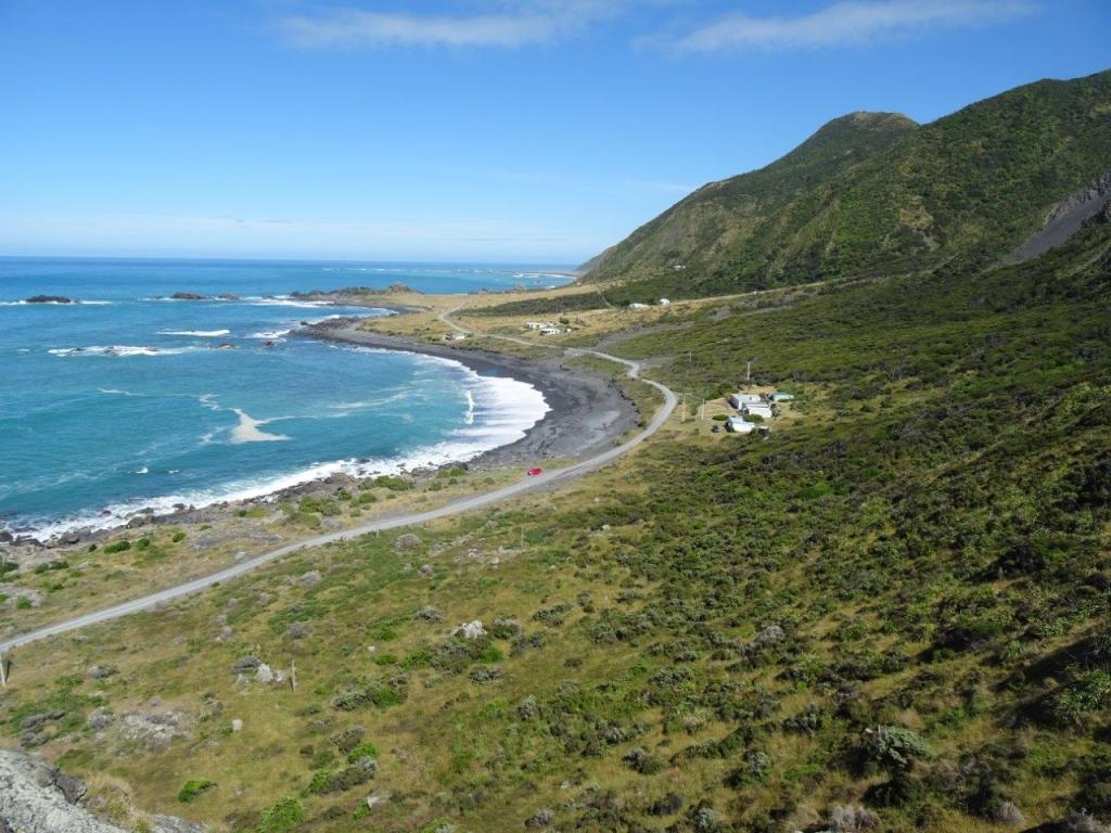 This is our last day on the north island and we’re not wasting a moment. Fortunately the plan was to get up early because just as I headed out the door bound for the shower a siren resounded around the town. When you’re in a place that is rocked by earthquakes, the sound of a siren is frightening. At least it was to us. But it wasn’t to any of our fellow campers and the earth didn’t move, so we went about our business as a fire engine roared out of town (that should have made me twig what the siren was about, but it didn’t). Reassured that nothing bad was happening, we finished getting ready and headed off for Cape Palliser. The books and websites describe the lighthouse and the seal colony but there is so much more to see there. The drive through the country side is incredibly pretty and then you come to the coast. The sheer cliffs falling straight into the ocean, but for the road carved into them, makes for some fantastic sightseeing and hairy driving. Bend after bend we were both gobsmacked and thrilled by the scenery and we were blessed with a crystal clear, warm sunny day. After yesterday this in itself was amazing!