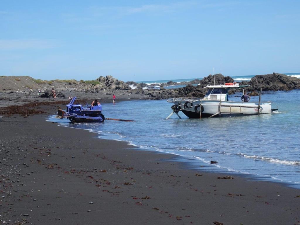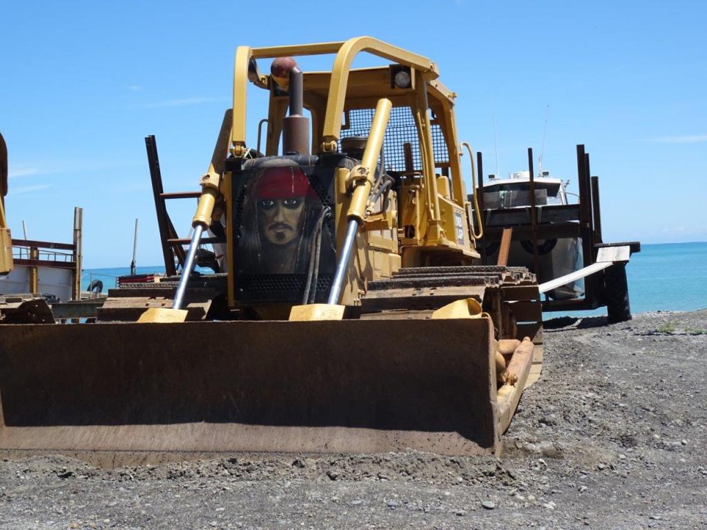 Finally The Newby dragged me away and we headed along the coast to the boat launching area. Now that sounds boring and dull but I can assure you it’s anything but. The water here must get very rough and the beach must be liable to change while the fisho’s are at sea because they have launching graders with the longest draw bars I have ever seen. I guess the idea is that they machines can be high and dry while the trailer is in the water, and if need be the grader can carve a way to or from the water line through any sand or gravel deposited on the beach. In the spirit of craziness that seems to infuse this place, the machines are painted and decorated. My favourite is Capt’n Jack or the purple one (of course), which we got to see in action. The fishing must be good to warrant all this equipment and effort.