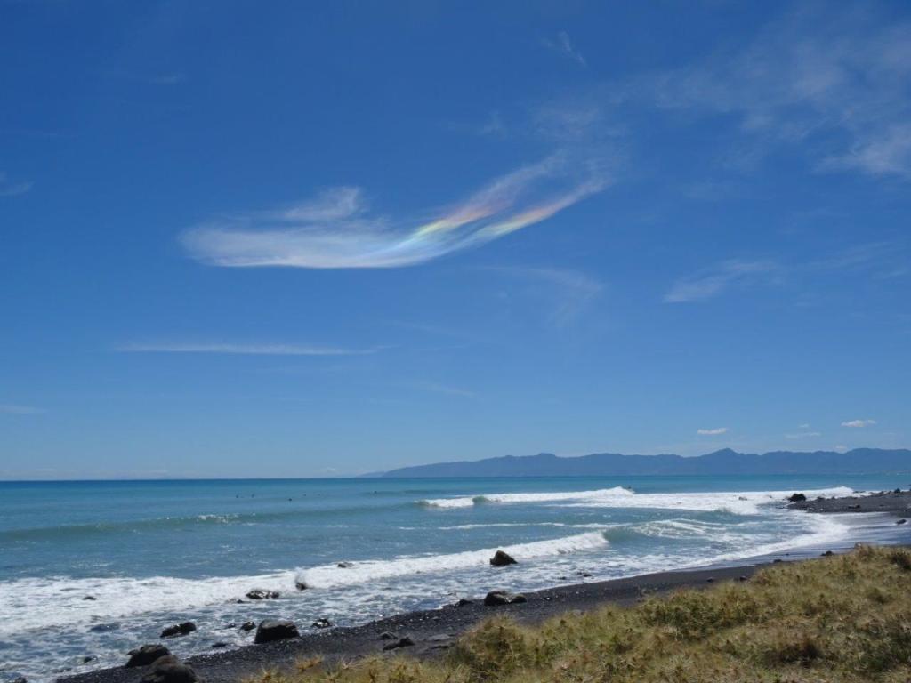 Eventually our stomachs told us it was time to eat so we found a patch of coastline, parked the van strategically and plonked ourselves in the sunshine to watch the surfers carve through the waves. This is the type of day I dreamed about as we were planning this trip so I was in no hurry to move along. The addition of the phenomenon of an iridescent cloud topped off our day in the part of NZ’s north island. What an amazing sight and something I have not ever seen before. But all good things must come to an end and we left the Cape to explore the road to Wellington. Along the way we found a gorgeous church with the most beautifully overgrown graveyard. Of course we were chasing a cache, which we found, or rather The Newby found, after the Muggles had left. This church and the surrounds are indicative of the sheer beauty of NZ and the pride the country has in its landscapes and buildings.